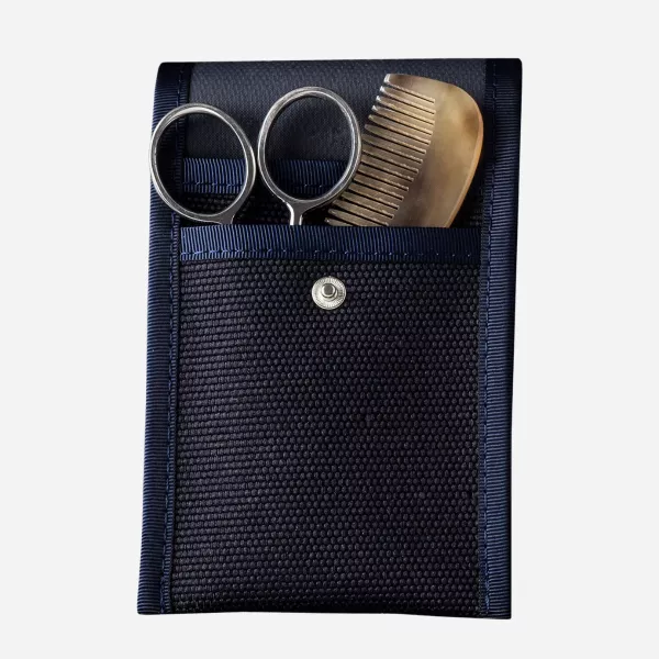 Set mit einem Kamm und einer Schere, die für die Pflege von Bärten und Schnurrbärten geeignet sind. Marineblaues Stoffetui.