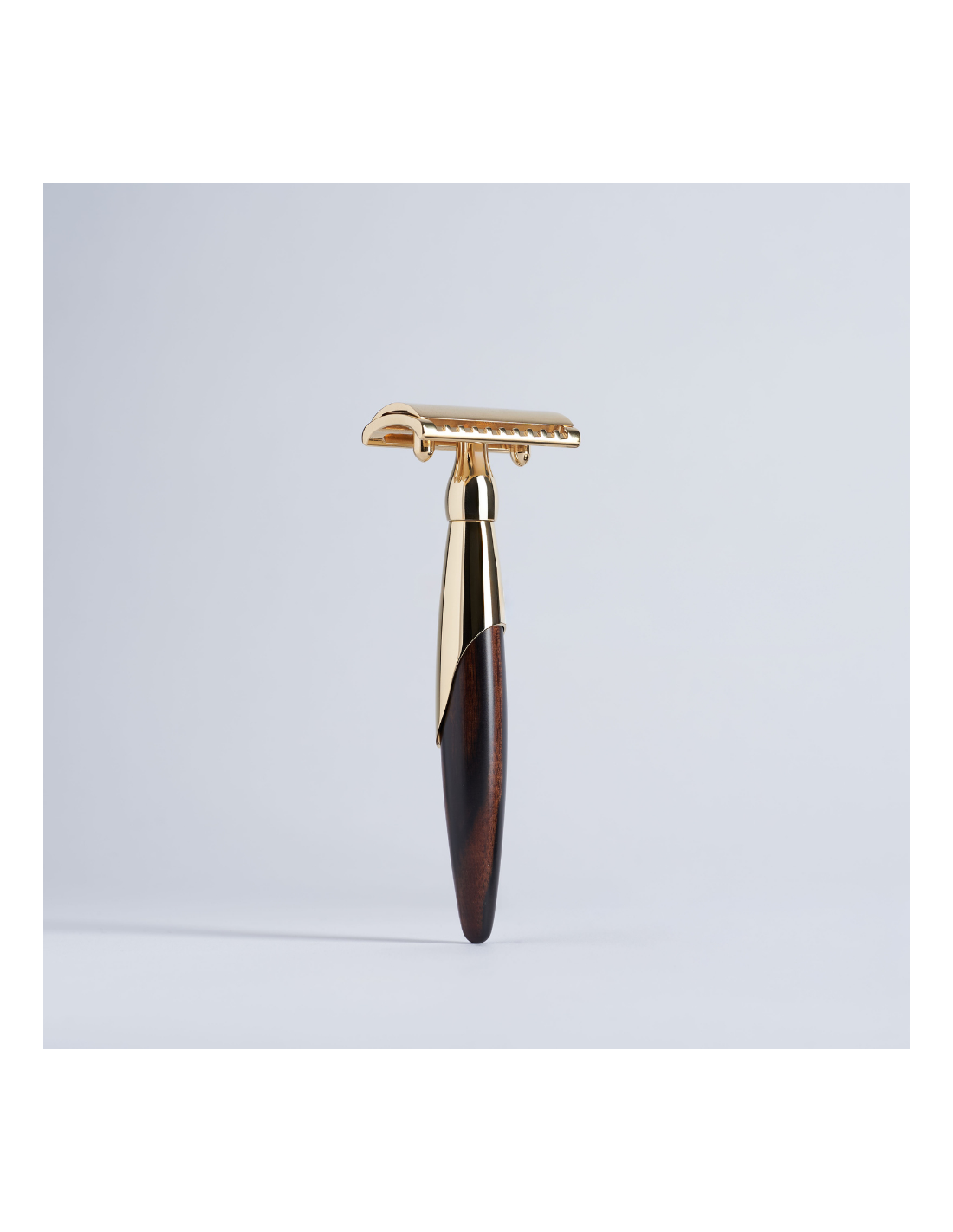 Bemerkenswerter Rasierer aus Palisanderholz – robust, dicht und von wunderschöner, einzigartiger Farbe, die jedes Stück individuell macht, kombiniert mit Messing in 24 Karat Gold-Finish.