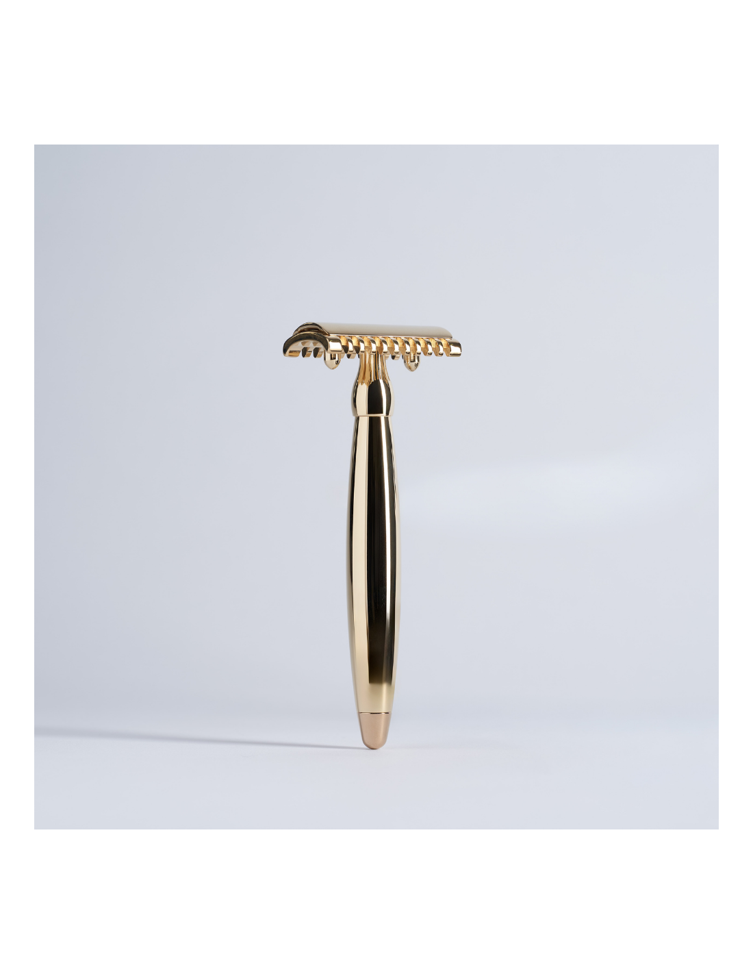 Ein eleganter Rasierer aus massivem Messing Vollendung reines Gold 24 Karat. Der polierte Spiegeleffekt des Griffes bringt diesem schönen Objekt eine raffinierte und aufwendige Note. Das ziemlich bedeutende Gewicht ist gut ausgewogen, damit die Gesten sehr präzise ausgeführt werden können, für die perfekte Rasur. Wir schlagen Ihnen dieses Modell mit zwei Rasierköpfen vor : Sicherheitskopf mit offenem Kamm für eine effiziente Rasur oder mit geschlossenem Kamm für eine sicherere Rasur.