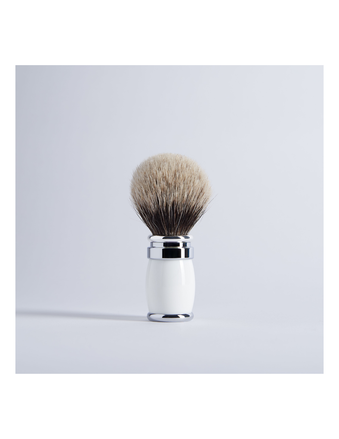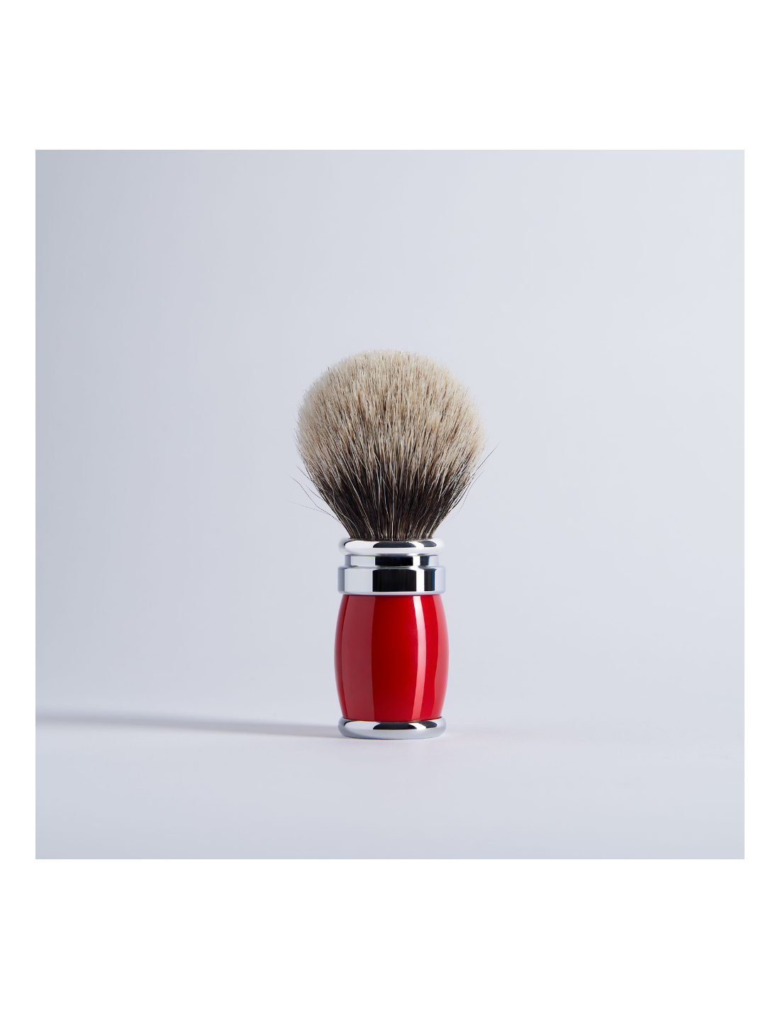Eleganter Dachshaar-Rasierpinsel in glänzendem Lack und Messing in Palladium-Finish. Dieses Modell aus der Joris-Kollektion in Form eines Fasses gewährleistet einen angenehmen und stabilen Griff. Die Materialien, die mit größter Sorgfalt ausgewählt wurden, berücksichtigen die Einhaltung von Umweltstandards. Der Schraubenkopf ist abnehmbar und mit einem europäischen grauen Büschel verziert, ist nervöser und fester. Diese Eigenschaften, kombiniert mit seiner Weichheit, machen ihn zu einem der meistverwendeten Rasierpinsel.