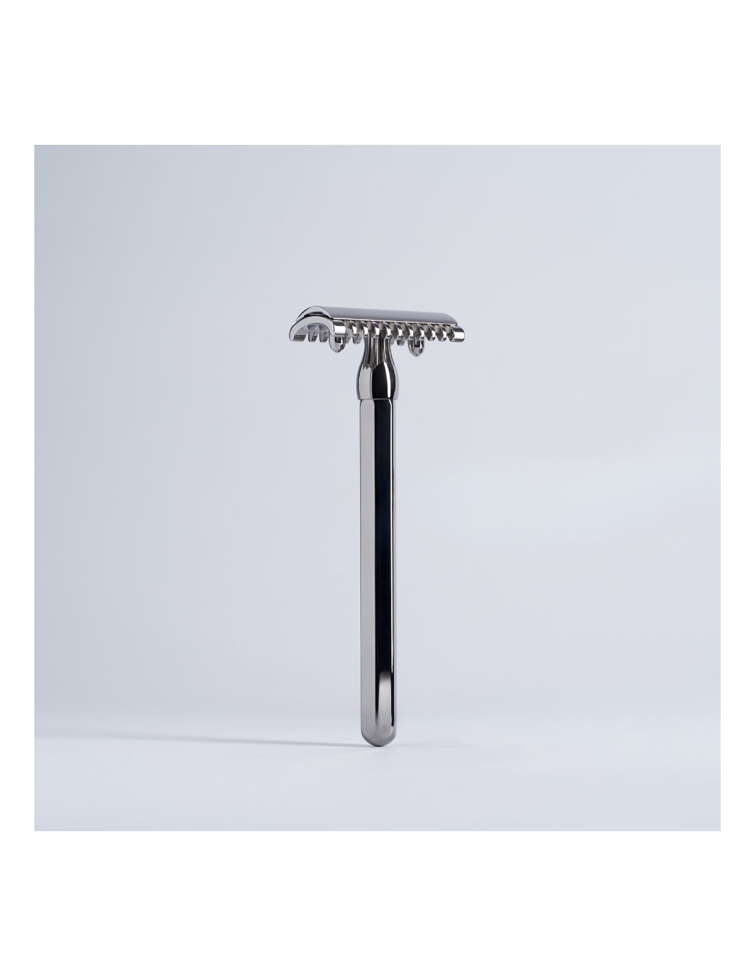 Sechseckiges Rasierhobel aus massivem Messing mit Ruthenium-Finish.