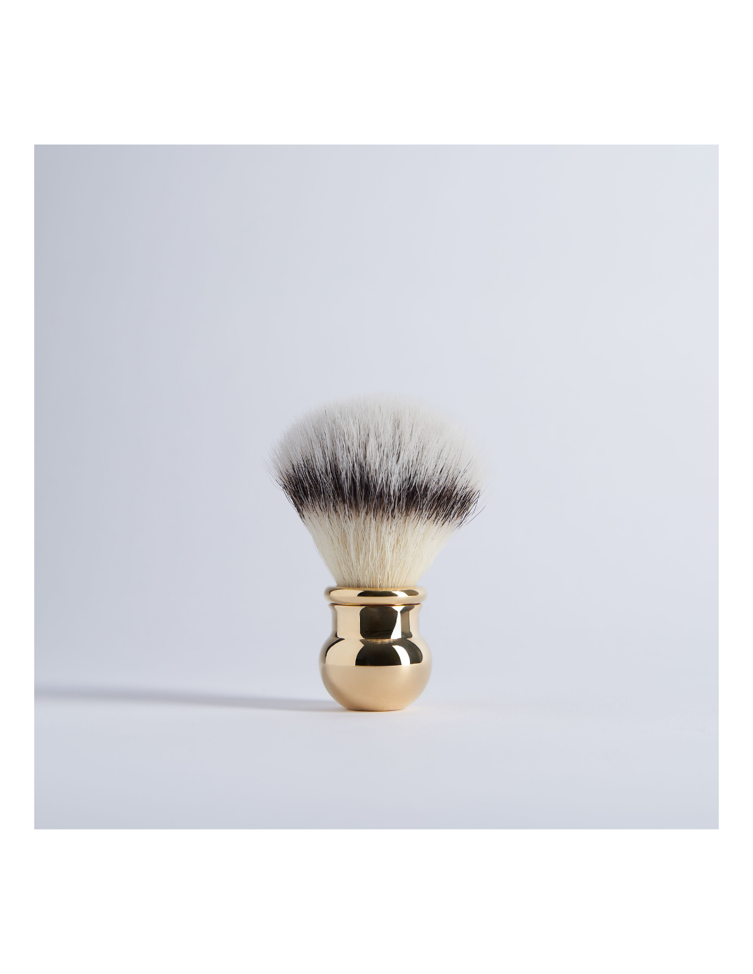 Dieser Rasierpinsel aus massivem Messing mit 24-karätigem Goldfinish liegt dank seines Gewichts und seiner ikonischen Form, die Nüchternheit und Zweckmäßigkeit miteinander verbindet, gut in der Hand. Er ist mit einer herausnehmbaren, widerstandsfähigen und hygienischen "Weißer Hochgebirgs"-Synthetikfaser gefüllt, die von der Weichheit und Geschmeidigkeit der besten unserer natürlichen Rasierpinsel inspiriert ist. Das macht ihn zum idealen Produkt für empfindliche Haut, für den veganen Lebensstil und für alle, die ein langlebiges Accessoire suchen. Hergestellt in Frankreich und handgefertigt von unseren Handwerkern.