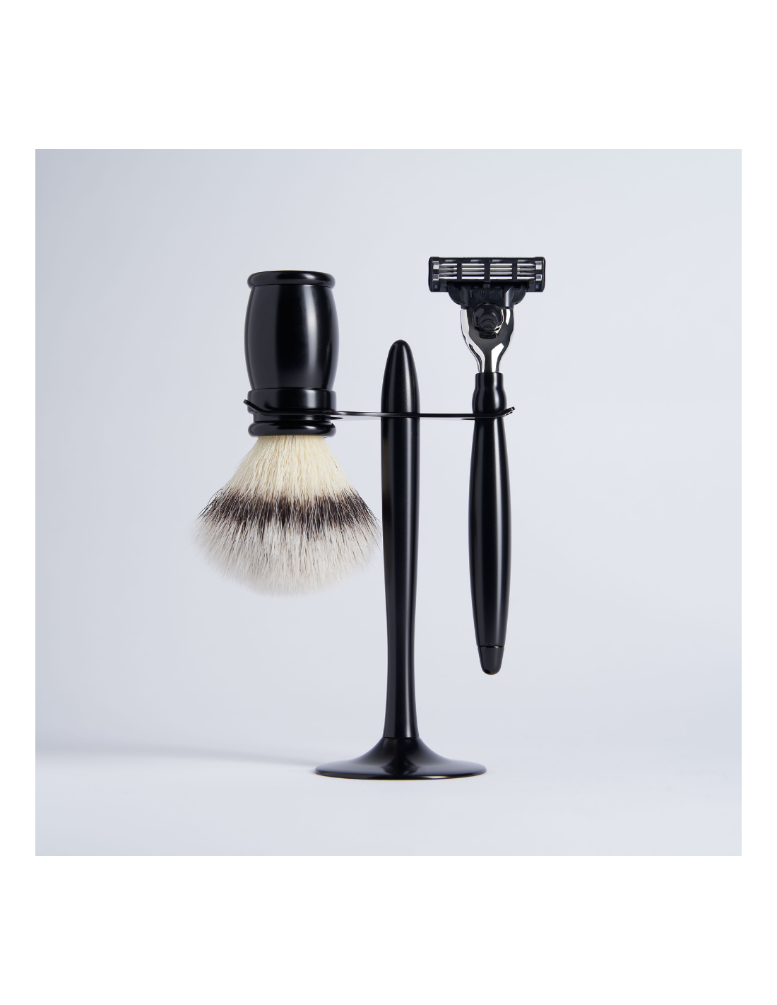 Ein prestigeträchtiges Set, bestehend aus drei massiven Messingteilen mit einer eleganten Ausführung in Unendlichem Schwarz. Dieses Set umfasst einen Mach3-Rasierer, einen Rasierpinsel mit austauschbarem Besatz aus synthetischer Weißer Hochgebirgsfaser, alles auf einem stilvollen Ständer präsentiert. Ein Hauch von Eleganz im Badezimmer eines Gentlemans.