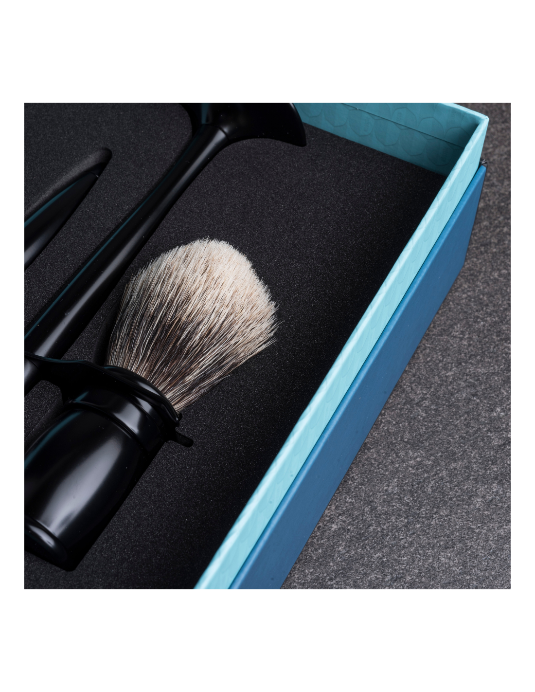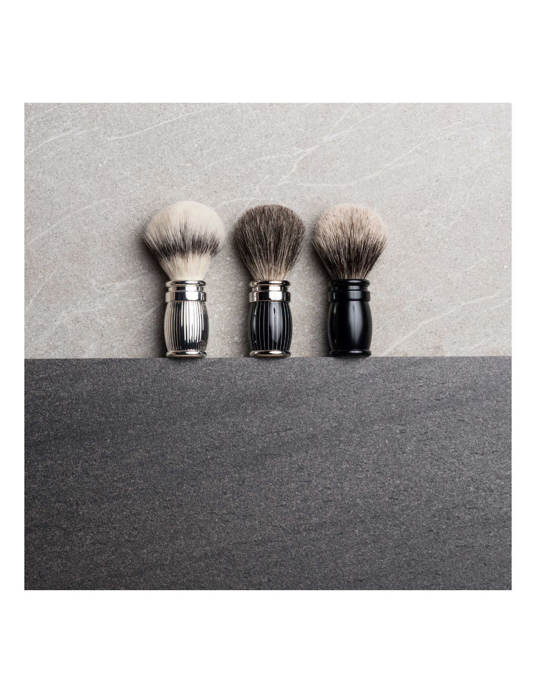 Rasierpinsel aus massivem Messing mit einem Finish in Infinity Black. Dieses Modell aus der fassförmigen Joris-Kollektion sorgt für einen angenehmen und stabilen Griff. Dieser Rasierpinsel wird in der Größe 12 angeboten, die ideal für den täglichen Gebrauch ist.