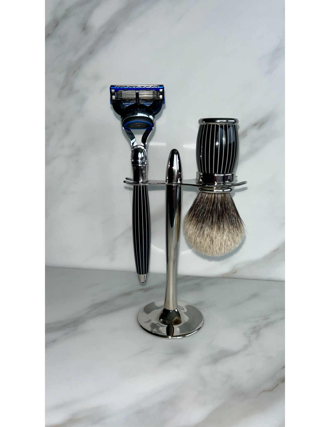Das Set besteht aus einem Fusion-Rasierer, einem Rasierpinsel mit einem abnehmbaren Pinsel aus unserem grauen europäischen Haar und wird auf einem eleganten Diener präsentiert.