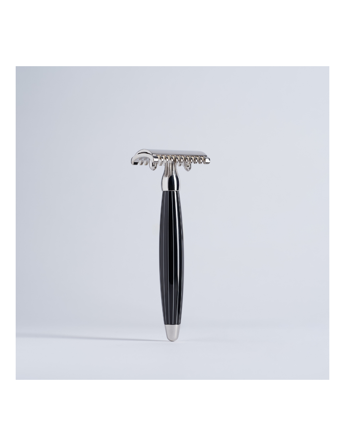 Traditioneller Rasierer in schwarz-weißer Retro-Lackierung und massivem Messing mit Chromfinish. Offener oder geschlossener Kamm.