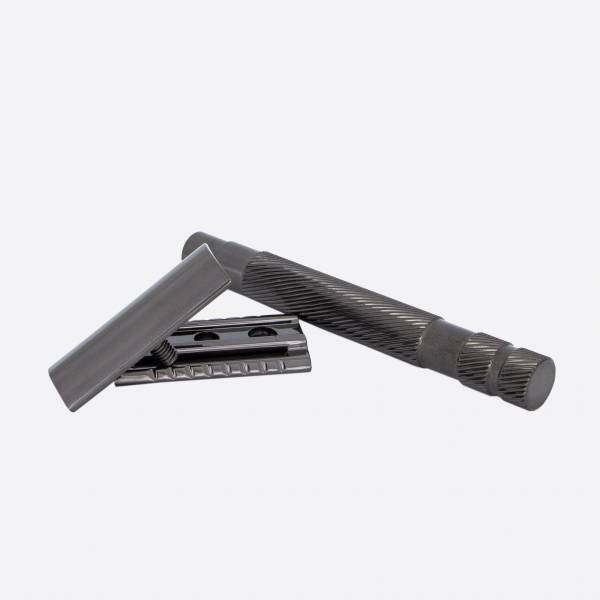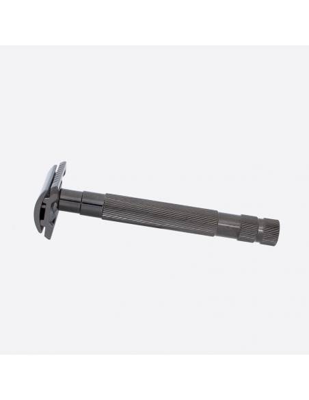 Sicherheitsrasierer aus schwarzem Stahl aus der Kollektion Plisson Essential. Kompatibel mit Standard-Sicherheitsklingen, Rasiermesser mit geschlossenem Kammkopf. Ergonomisch und leicht zu handhaben.