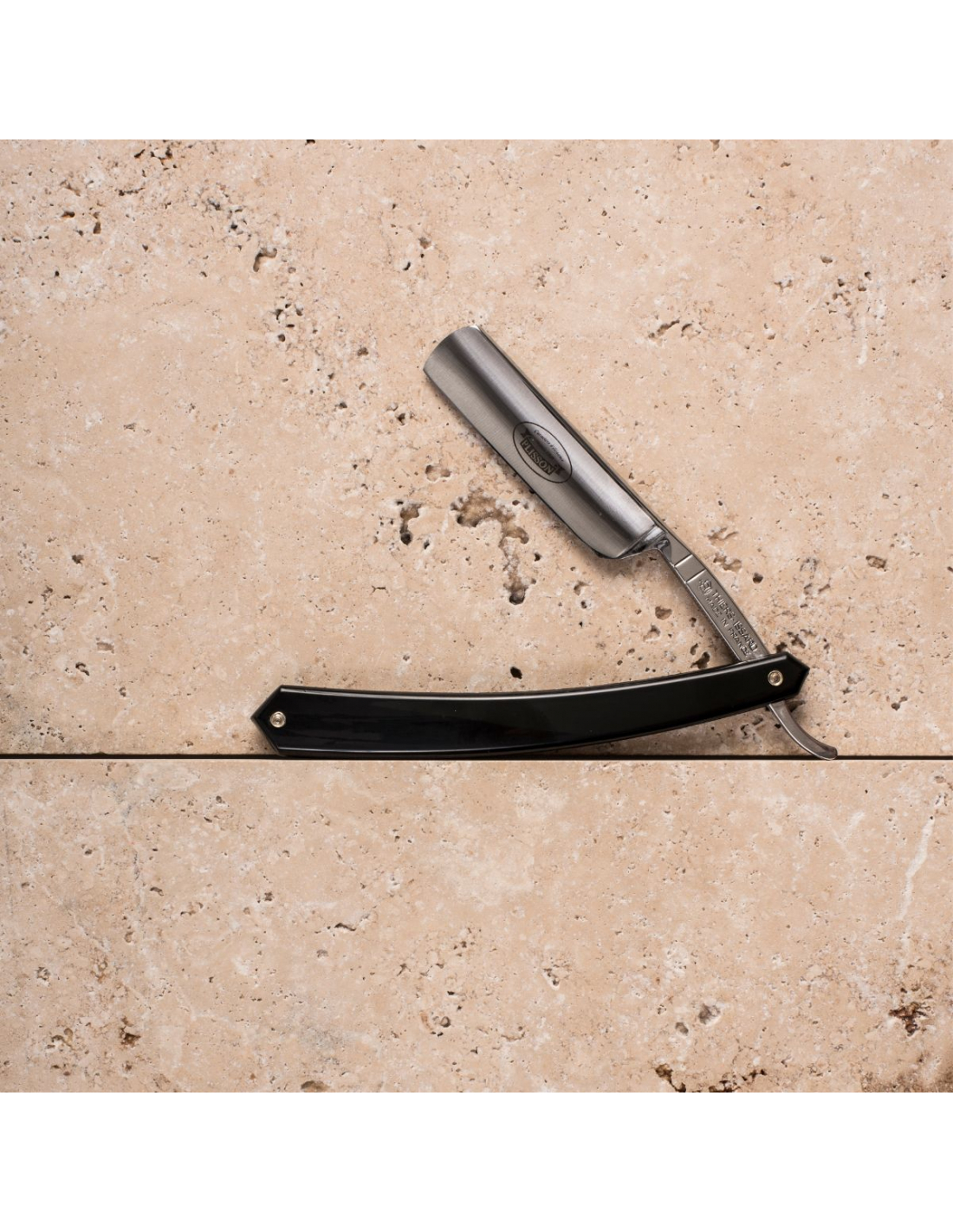 Sehr ergonomisches "Säbel"-Rasiermesser aus Kohlenstoffstahl C135, aus der besten handwerklichen Tradition der Thiers-Issard-Werkstätten in Frankreich. Ein schwarzer Acetatgriff, elegant und handlich. Die sehr dünne und ausgehöhlte Klinge gewährleistet eine perfekte und gleichzeitig sanfte Rasur. Die rutschfeste Einkerbung auf der Unterseite der Seide für mehr Sicherheit. Dieses Rasiermesser wird in seinem eleganten schwarzen Lederetui geliefert.