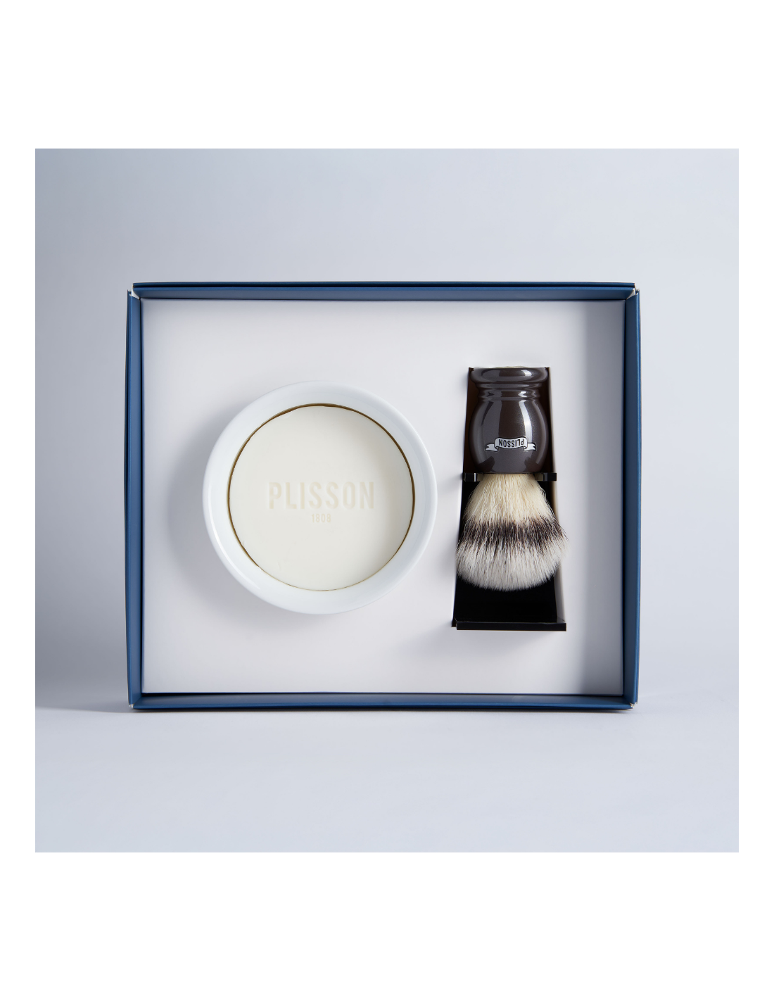 Traditioneller Harzgriff in verschiedenen Farben erhältlich. Plexiglashalter und Schale aus Limoges-Porzellan mit Bartseife.