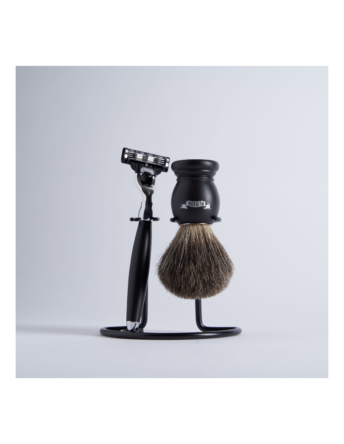 Wunderschönes dreiteiliges Set aus schwarzem Buchenholz und verchromtem Messing. Garnitur aus reinem Russisch-Grauen Dachs - ein Haar zwischen reinem Schwarz und reinem europäischen Grau, ideal für harte und halbharte Bärte. Standardgröße 12, optimal für den täglichen Gebrauch. Der passende Rasierer ist mit einem Mach3-Kopf von Gillette ausgestattet. Der passende Servierer aus schwarzem Stahl wird eine dekorative Note hinzufügen und gleichzeitig für eine effiziente Aufbewahrung sorgen. Wie alle Produkte von Plisson wird auch dieses Set in Frankreich hergestellt.