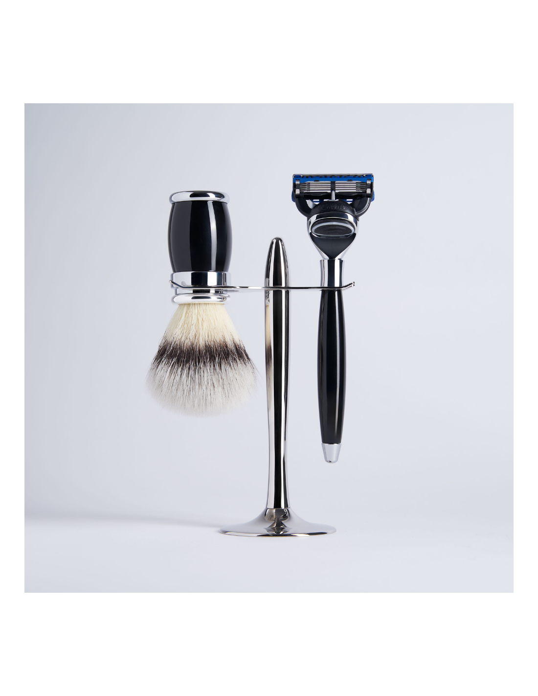 Prestigiöses dreiteiliges Set, veredelt durch eine elegante Chrom-Oberfläche. Dieses Set enthält einen Fusion-Rasierer, einen Rasierpinsel mit abnehmbarem Knoten aus hochwertiger Synthetikfaser, alles präsentiert auf einem stilvollen Halter.