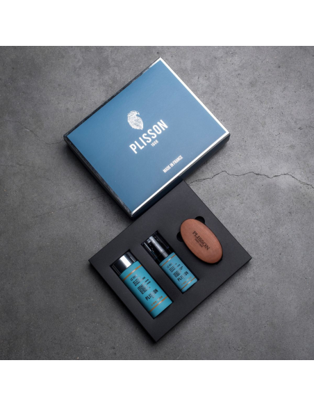 The products are delivered in an elegant small black pouch, adorned with the Plisson logo in blue, for a neat and refined presentation.