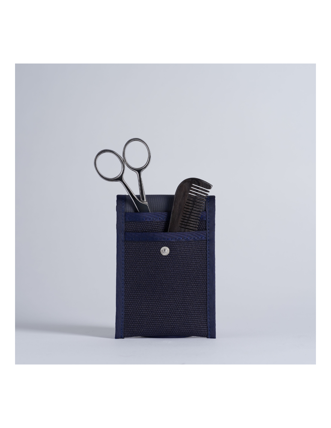 Set containing a black comb and scissors suitable for the care of beards and moustaches. Navy blue fabric case.