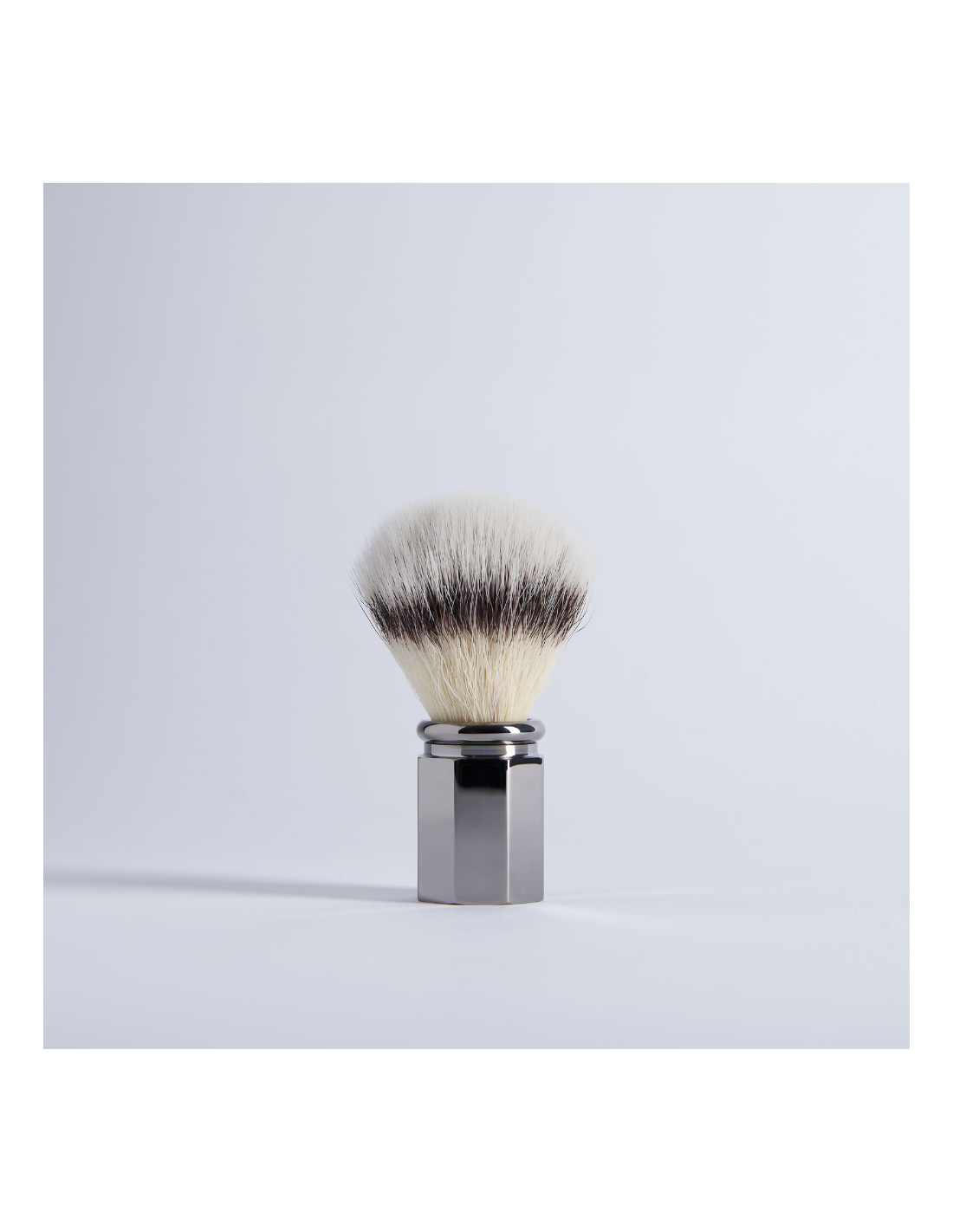 A beautiful shaving brush from the Octagonal collection in a Ruthenium finish. The 'High Mountain White' fibre trim is known for its exceptional softness and suppleness and mimics the qualities of the finest badger hair. Removable screw-on tuft. Size 12, standard.