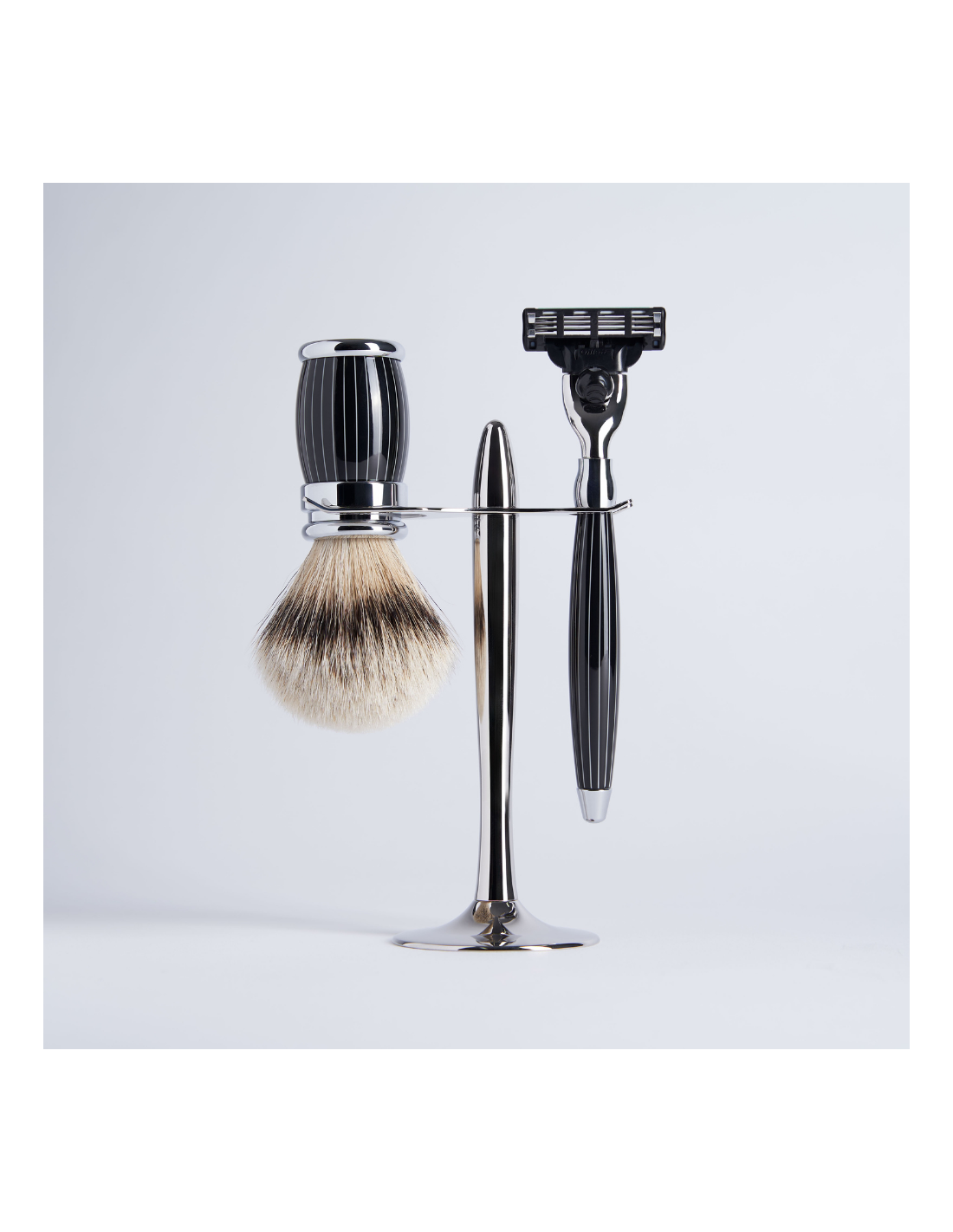 A prestigious gift set featuring three solid brass pieces with a chrome finish. This set includes a Mach3 razor, a shaving brush with a removable head made from our natural high-mountain goat hair, all presented on an elegant stand. Bring the elegance of the Joris collection’s retro lacquer finish to your bathroom—a timeless collection.