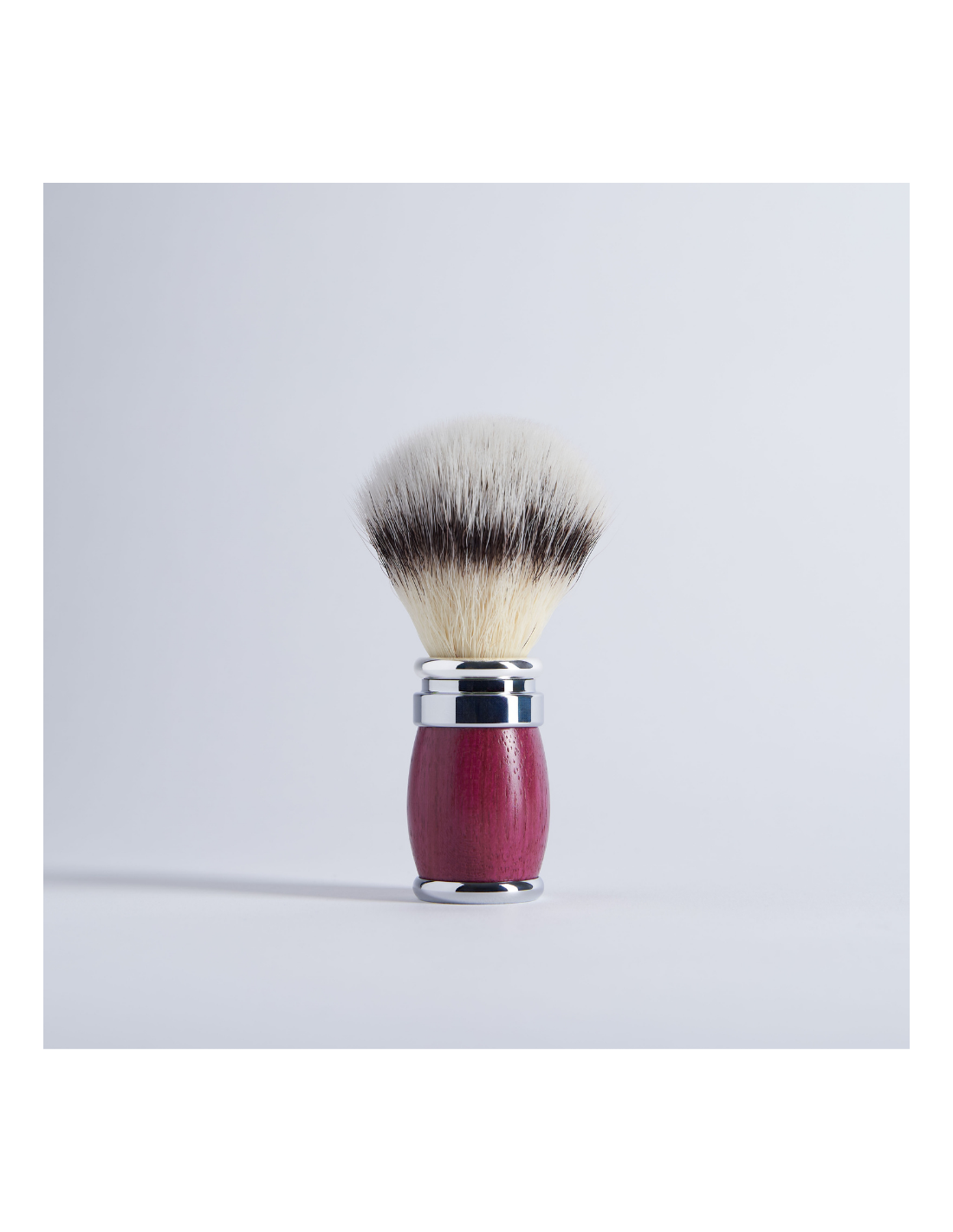 Amaranth wood shaving brush with a chrome finish. This barrel-shaped model from the Joris collection ensures a comfortable and stable grip. This brush is available in size 12, ideal for daily use. The screw-mounted head is removable and fitted with a "High Moutain White" fiber knot, perfect for sensitive skin. Delivered in its elegant packaging. Handcrafted in the Plisson workshops, in France.