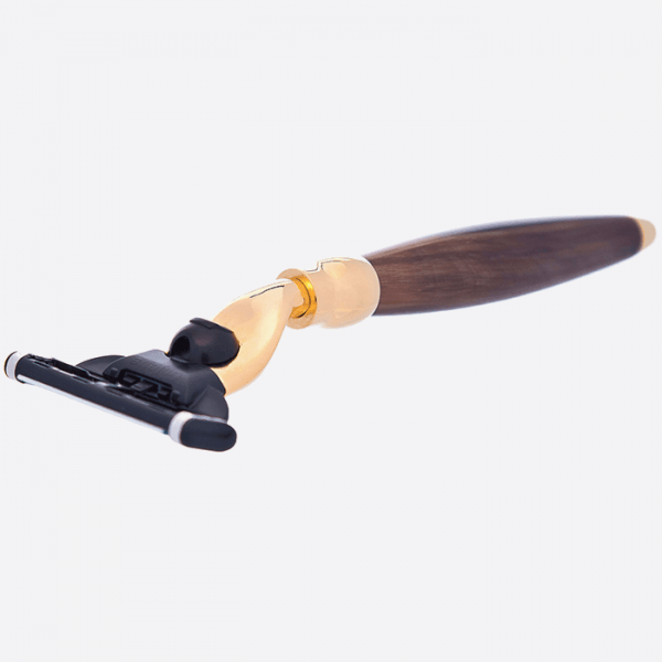 Perfect unity of precious metal and natural horn for a very elegant and clean cut look result. The razor handle is fashioned from the real horn, providing a unique and exceptional look for each piece. The head, made of solid brass with a 24 carat gold finish, is compatible with Gillette Mach3 blades. Each piece is well balanced and ergonomic, providing a stable and accurate grip for an efficient and fast shave. This razor, manufactured and assembled in Plisson’s workshop in France, is a perfect complement to the horn and brass matching shaving brush.