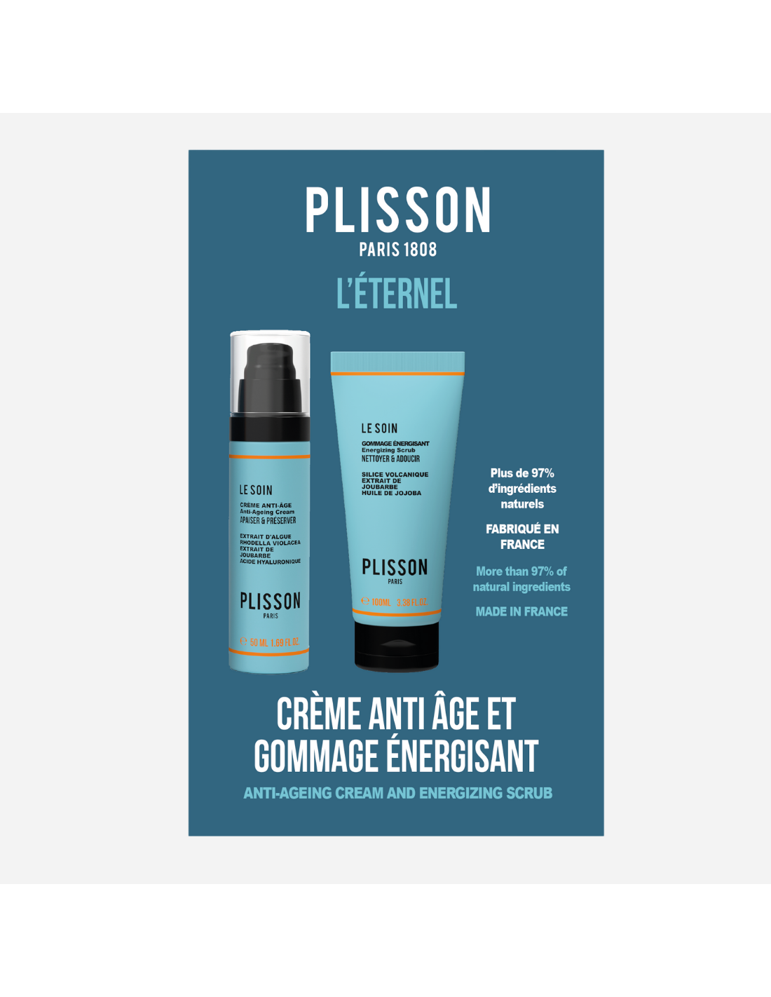 Faithful to Plisson 1808 excellence, this duo combines the effectiveness of an energizing scrub with the regenerating action of an anti-aging cream. A men’s skincare ritual that purifies, smooths, and revitalizes the skin, blending tradition and innovation for visible and lasting results.