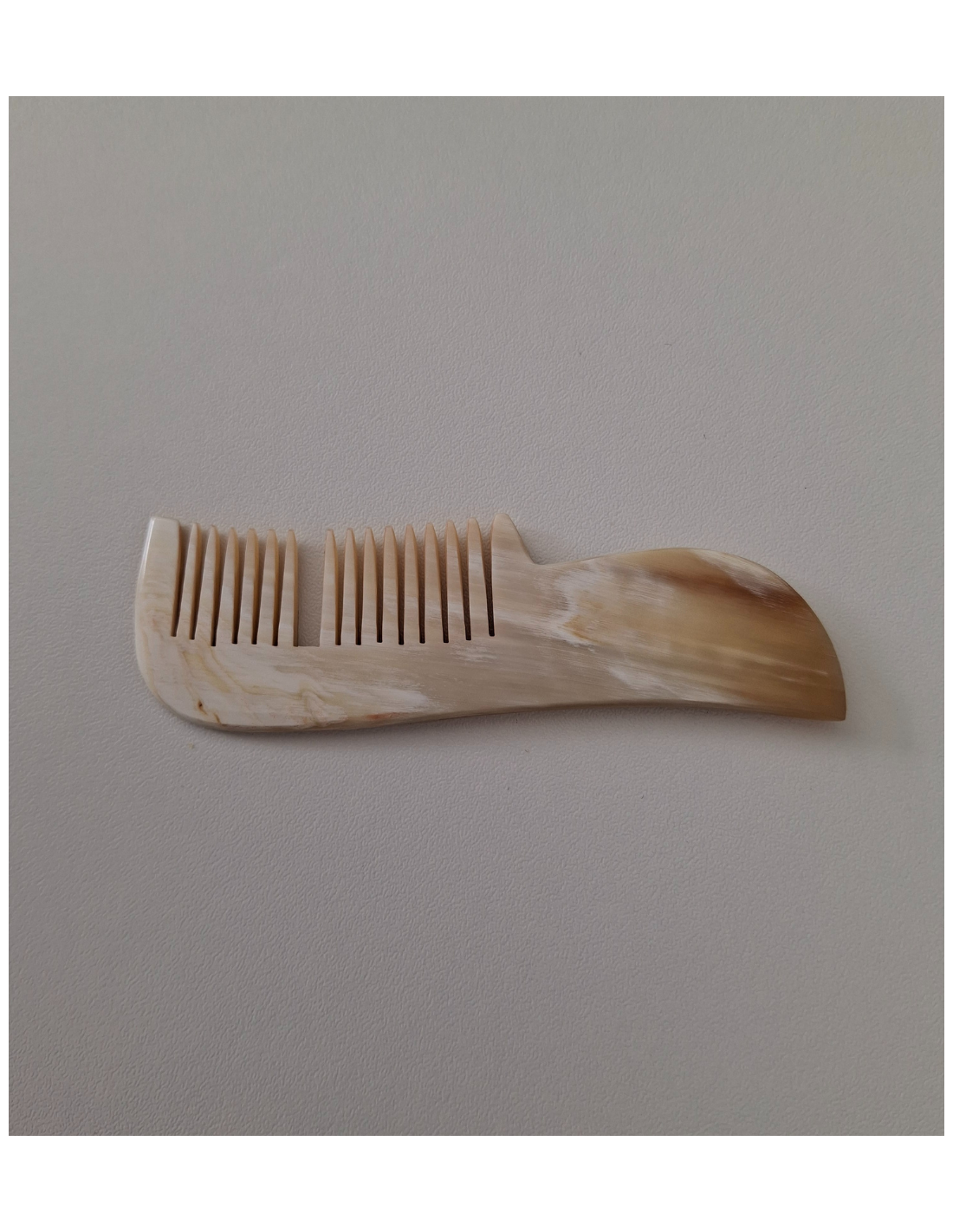 Smooth and tame your moustache with this natural horn comb, antistatic and gentle on the hair. This model has a small flaw – a broken tooth – but it retains its full effectiveness and artisanal charm.