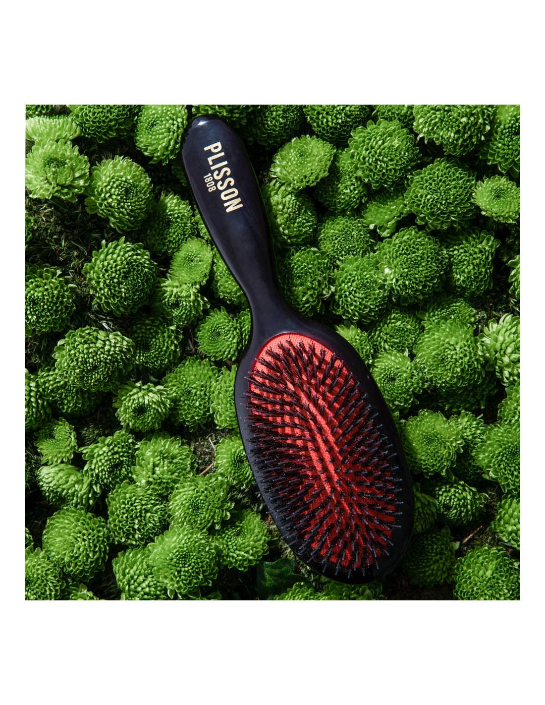 Medium pneumatic hairbrush (21 cm), combining the soft, fine and long nylon picots with real wild boar hairs, rigorously selected, for a perfect detangling and relaxing scalp massage. These are known for their antistatic qualities and their ability to clean the scalp: elimination of impurities and excess natural fat from the hair. The hair and pimples are mounted on a latex pad that regulates the pressure exerted on the scalp during brushing. Your hair becomes healthy and shiny again. The handle, made of ABS, is ergonomic and very pleasant to handle. This practical format is ideal for enhancing medium-length hair.