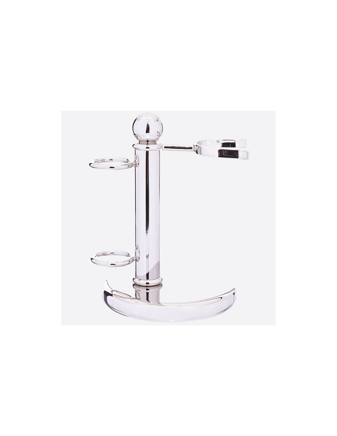 Stylish but discreet design stand for a shaving brush and razor. Made of solid brass with a nickel finish, it has two closed rings, 20 mm diameter, accommodating all the razors from the Plisson collection and many others. The open ring will hold a shaving brush in its upside down position.