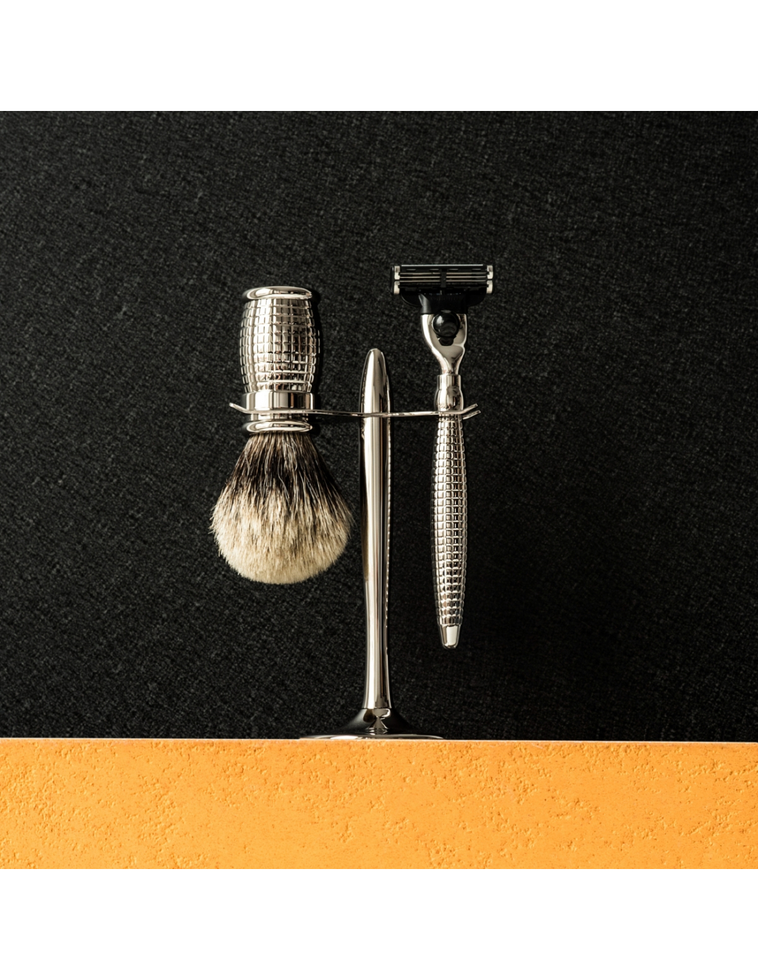 Razor with a sober and elegant design by Plisson. The handle in solid brass with a polished palladium finish, in a diamond pattern, is relatively heavy but well-balanced, for a comfortable grip and good precision of use. The Mach3 3-blade heads are versatile and ideal for frequent shaving and perfect results.