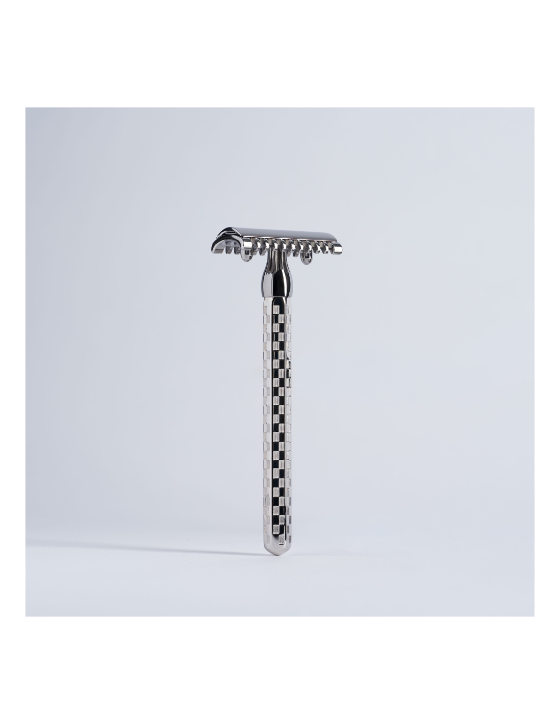 Hexagonal razor with tile pattern in solid brass with Palladium finish.