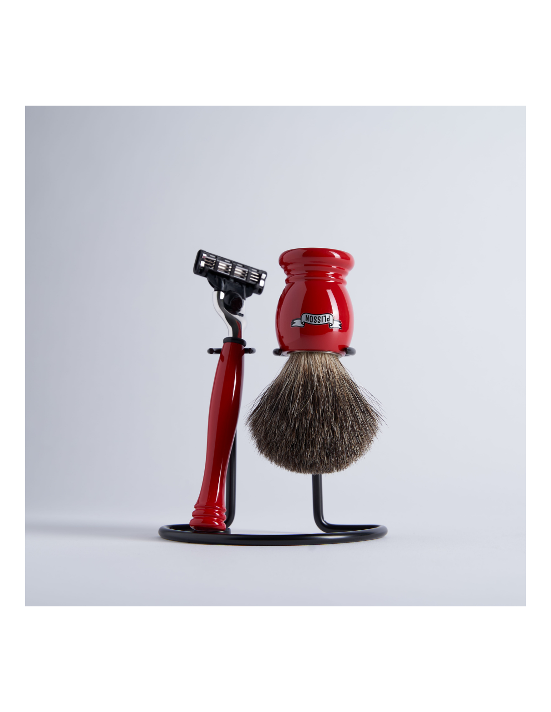 A beautiful set from the Essentiel range, ideal for a beginner's introduction to traditional shaving. The set consists of a magnificent shaving brush in size 12, the most commonly used, with the classic acetate handle and a trim of pure Russian grey badger, firm and invigorating for the skin. It's accompanied by its matching razor, fitted with a precise and efficient Gillette Mach3 head. All of this is enhanced by the matching black steel caddy, perfect for storing your shaving accessories.