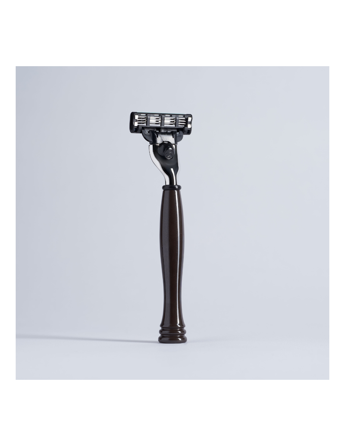 A beautiful set from the Essentiel range, ideal for a beginner's introduction to traditional shaving. The set consists of a magnificent shaving brush in size 12, the most commonly used, with the classic acetate handle and a trim of pure Russian grey badger, firm and invigorating for the skin. It's accompanied by its matching razor, fitted with a precise and efficient Gillette Mach3 head. All of this is enhanced by the matching black steel caddy, perfect for storing your shaving accessories.