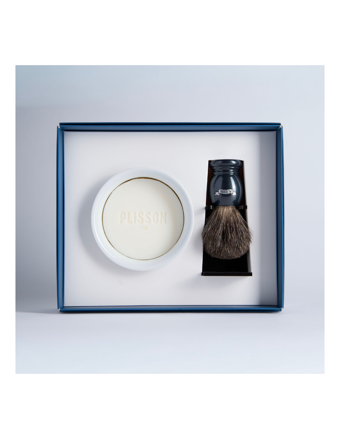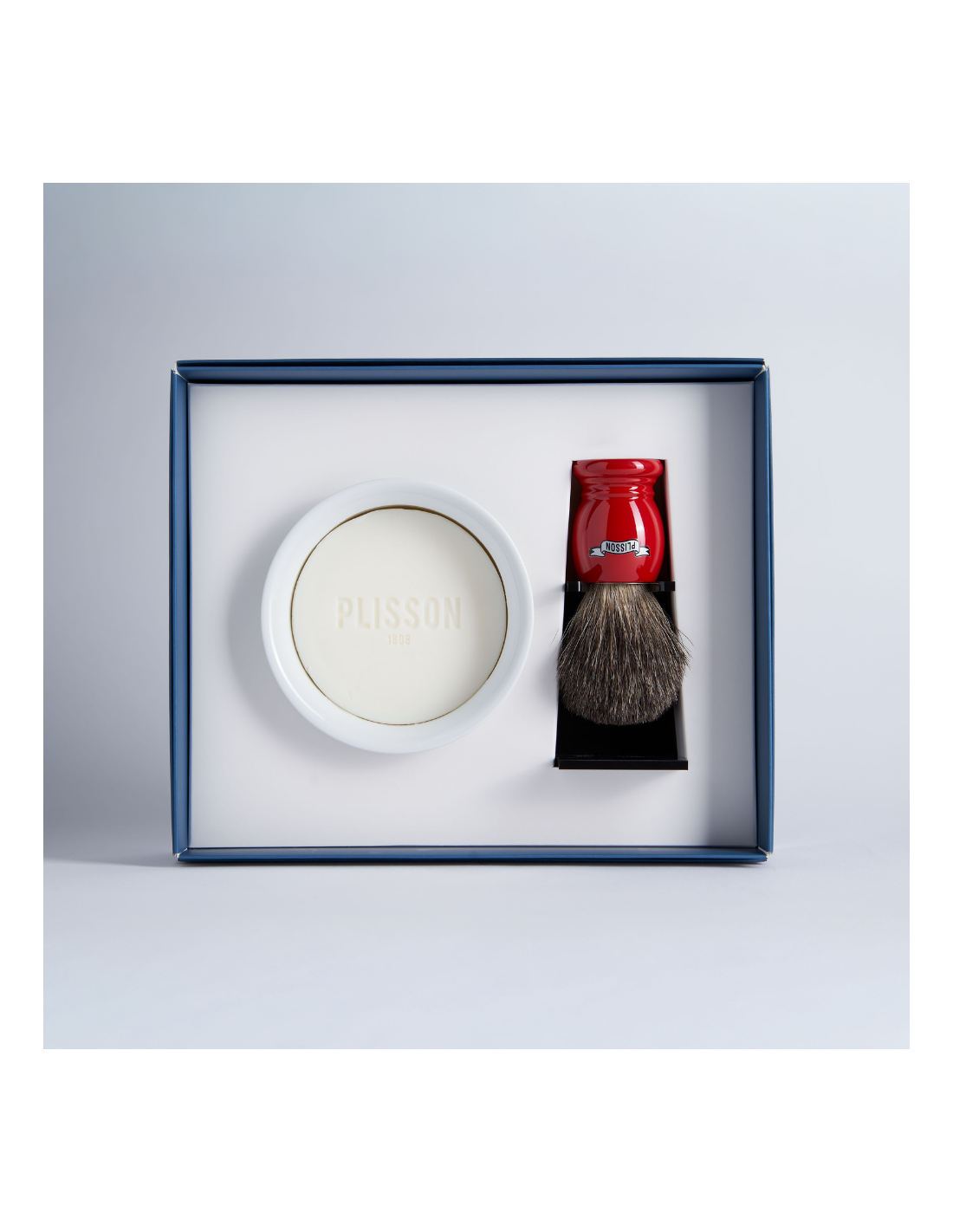 Traditional resin handle available in different colours. Plexiglass holder and Limoges porcelain bowl with its beard soap.