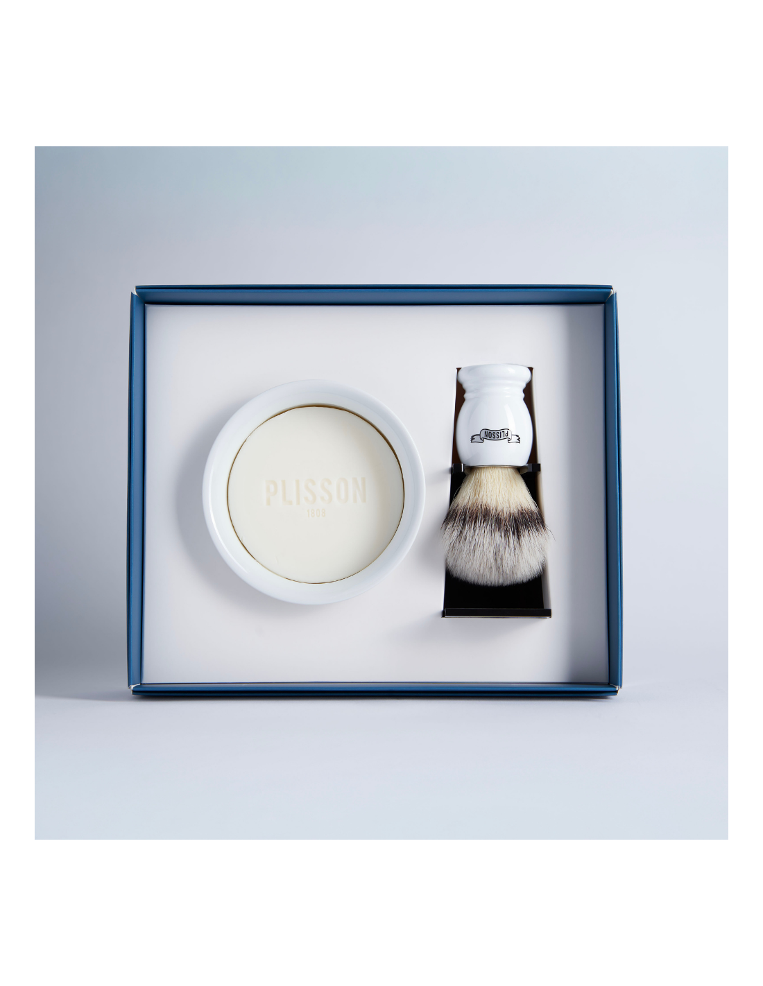 Traditional resin handle available in different colours. Plexiglass holder and Limoges porcelain bowl with its beard soap.