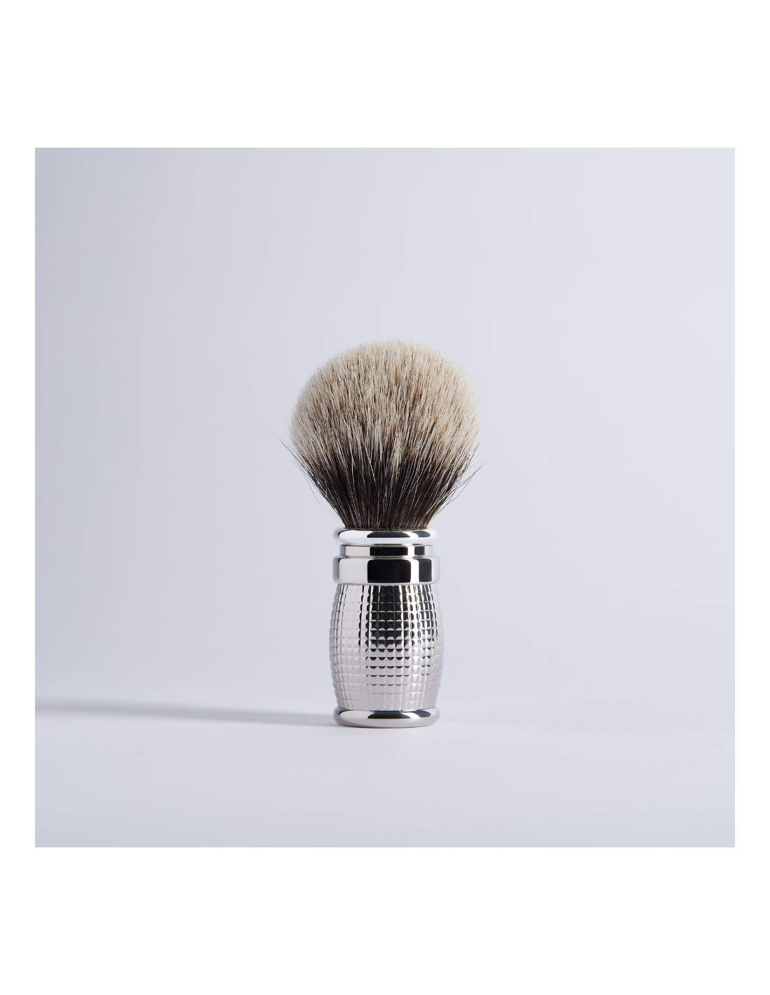 Superb shaving brush combining ergonomics and stylish design. Made of solid brass with a Palladium finish, it is characterized by its diamond pattern. With a nice and balanced grip, this brush is made entirely of genuine badger hair. Made in pure European Grey badger hair, a little bit firmer and more polyvalent, very efficient as well during the preparation of the lather as during its application on your face.