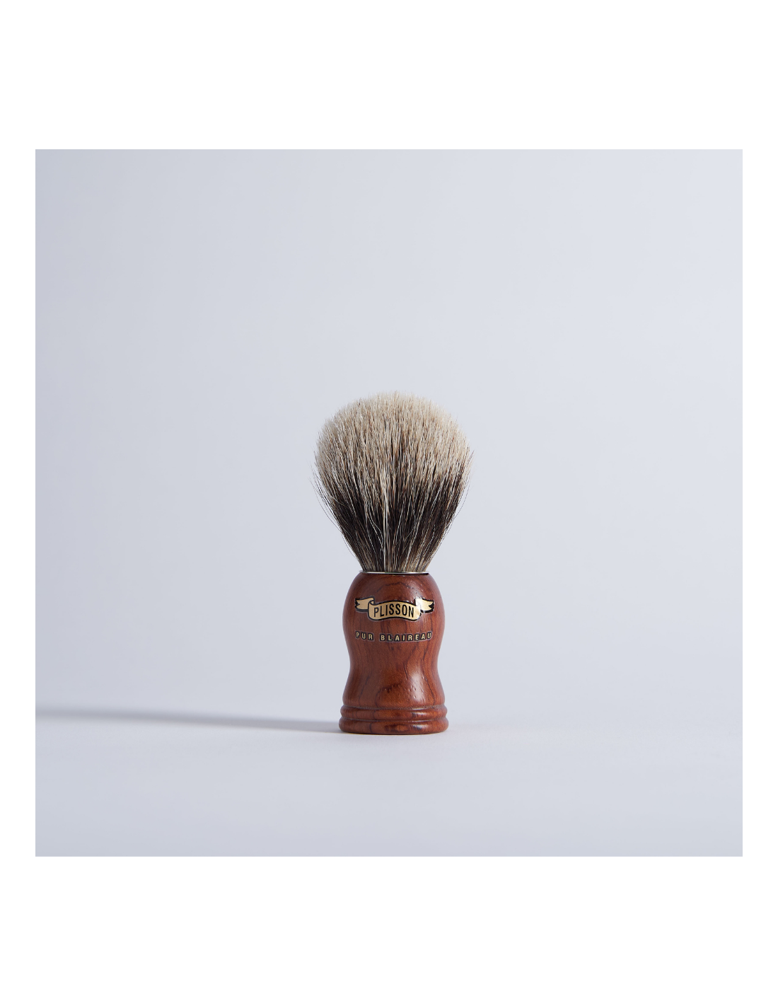 Stylish and ergonomic shaving brush made in Bubinga wood, with a red-brown shimmer aspect. The handle is slightly higher than the usual standard, to facilitate gripping. Filled with pure European gray badger hair, flexible but firm, with a very good ability to produce dense and abundant lather. Crafted by hand in Plisson’s workshop in France, this shaving brush is available in small (8,10) and medium (12) size. Comes in an elegant packaging.