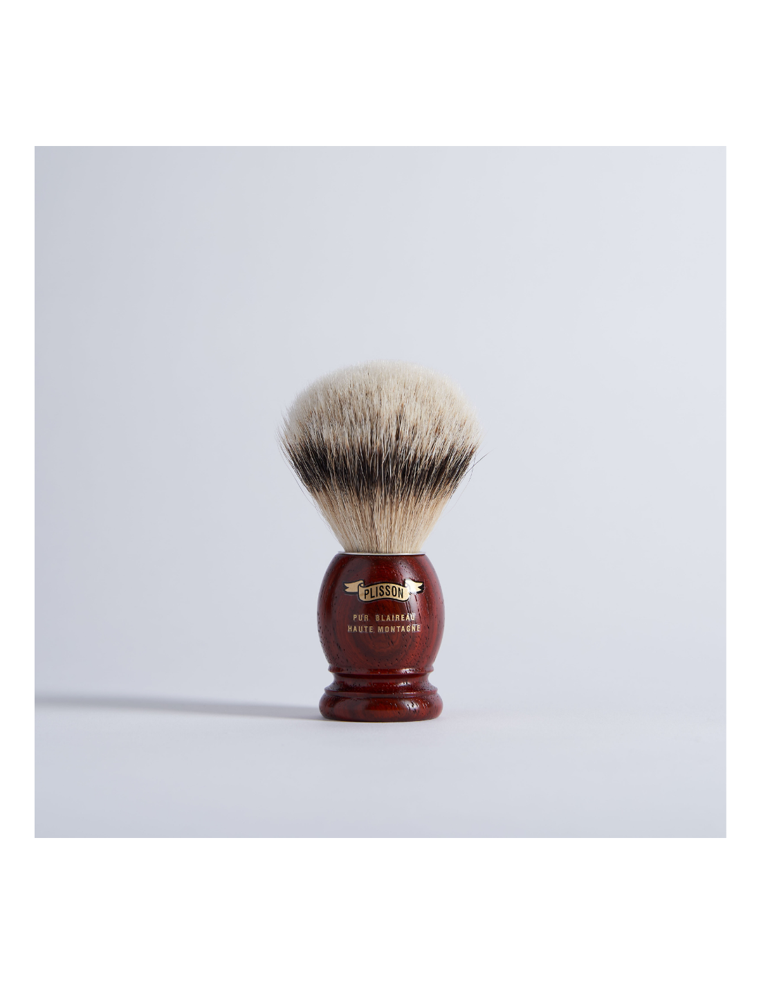 White High Mountain Shaving Brush with a handle made of Padouk, a precious wood with a bright red colour. As wood is a natural product, the colour and grain patterns can vary from one shaving brush to another, giving a unique dimension to each piece.