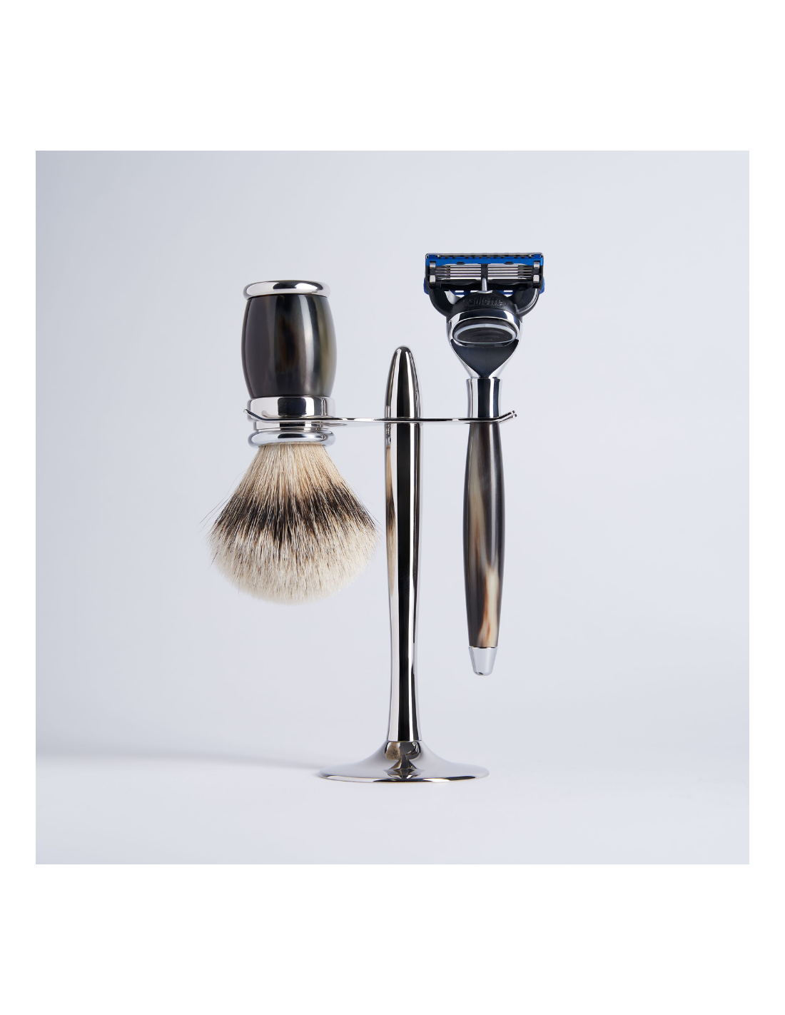A prestigious gift set featuring a razor and shaving brush made of horn, along with a stand. This set includes a Fusion razor, a shaving brush with a removable head made from High Mountain White hair, all presented on an elegant stand.