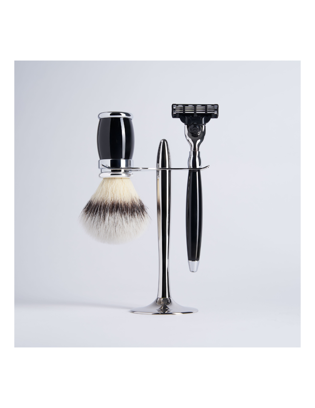 Prestigious 3-piece set made of solid brass, enhanced by an elegant chrome finish. This set includes a Mach3 razor, a shaving brush with a removable synthetic Plisson knot, all presented on a refined stand.