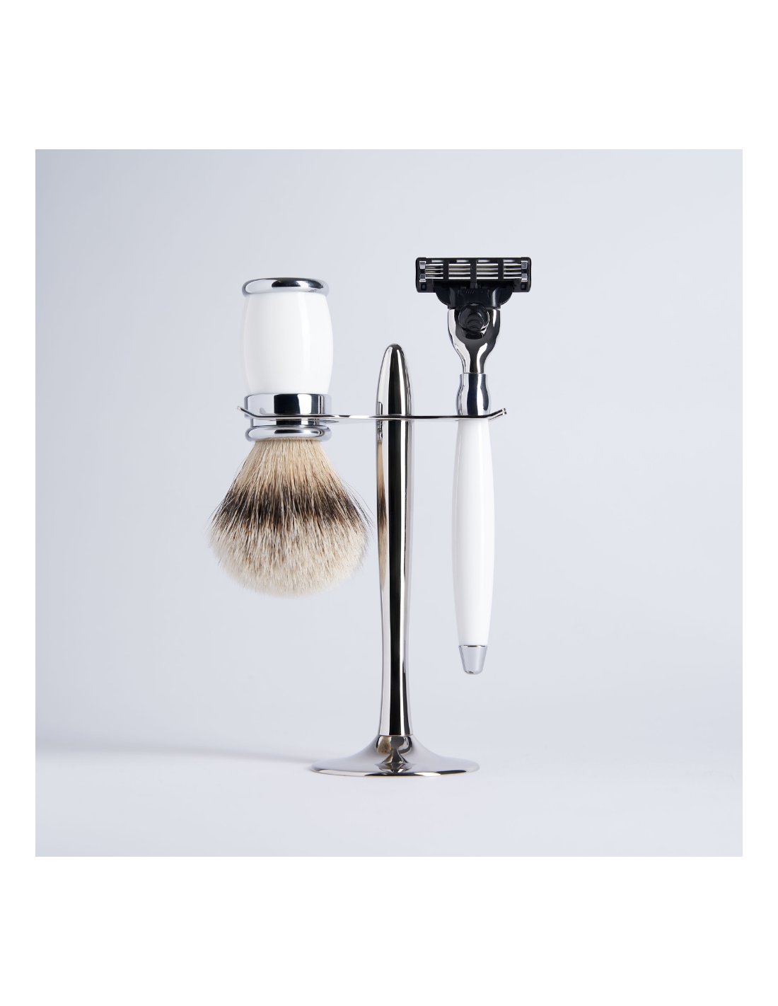 Beautiful three-piece white set. This set includes a razor compatible with Mach3 heads, a shaving brush with a removable High Mountain White bristle knot, all presented on an elegant stand.
