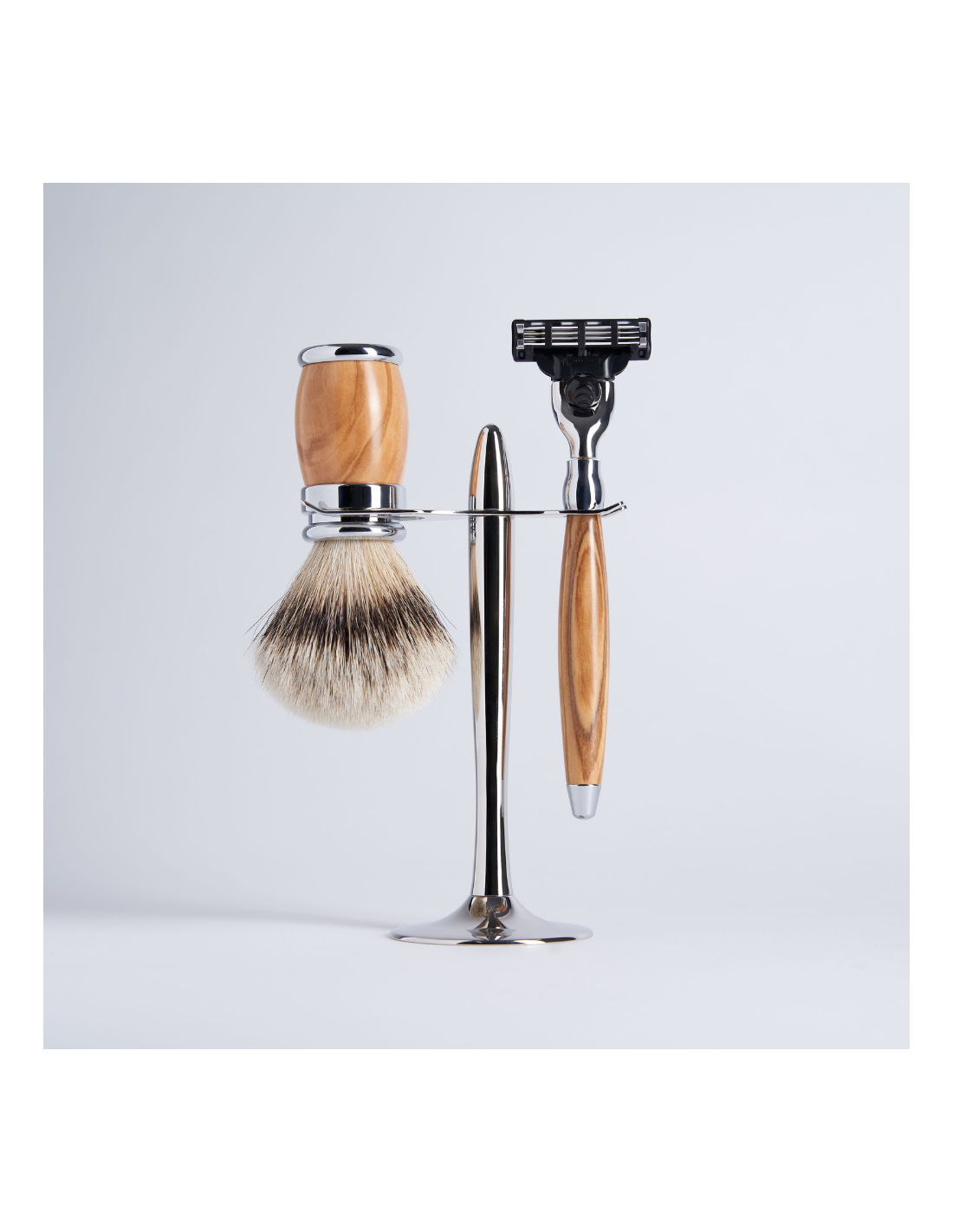 Prestigious three-piece set crafted from olive wood with a chrome finish. This set includes a Mach3 razor, a shaving brush with a removable knot of High Mountain White hair, all presented on an elegant stand. Discover the Joris collection with all the products for your shaving routine.