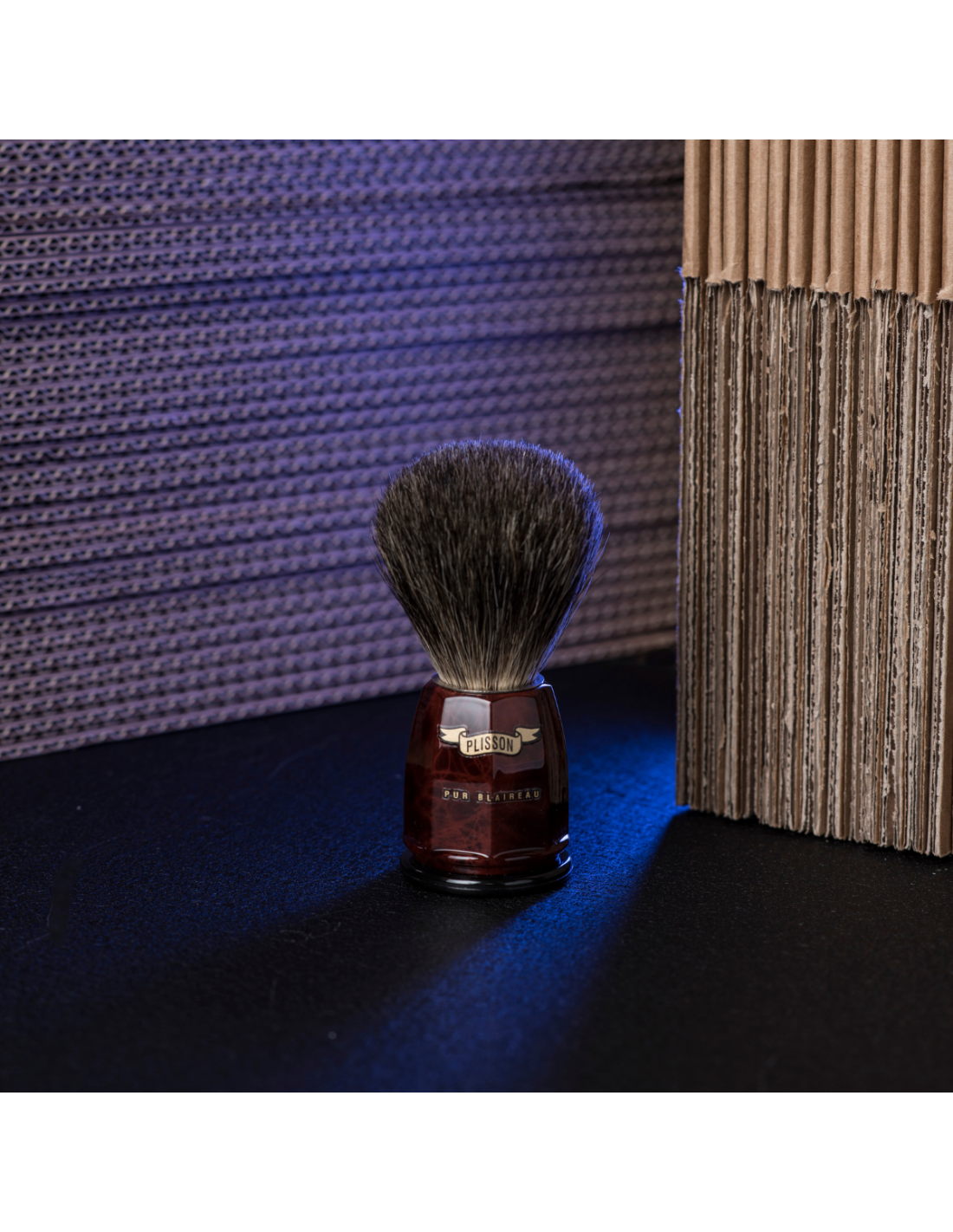 Brocha de afeitar tradicional con mango octogonal de acetato negro facetado. Recorte de pelo de tejón gris ruso puro. Hecho a mano en nuestro taller en Francia.