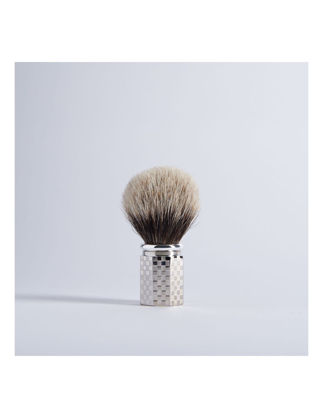 Elegante brocha de afeitar de la colección Octogonal disponible en acabado en paladio con un motivo de azulejos. La cabeza de la montura del tornillo es removible y recortada con un mechón gris europeo, es más nerviosa y firme. Estas cualidades, combinadas con su suavidad, lo convierten en uno de los tejones más utilizados.