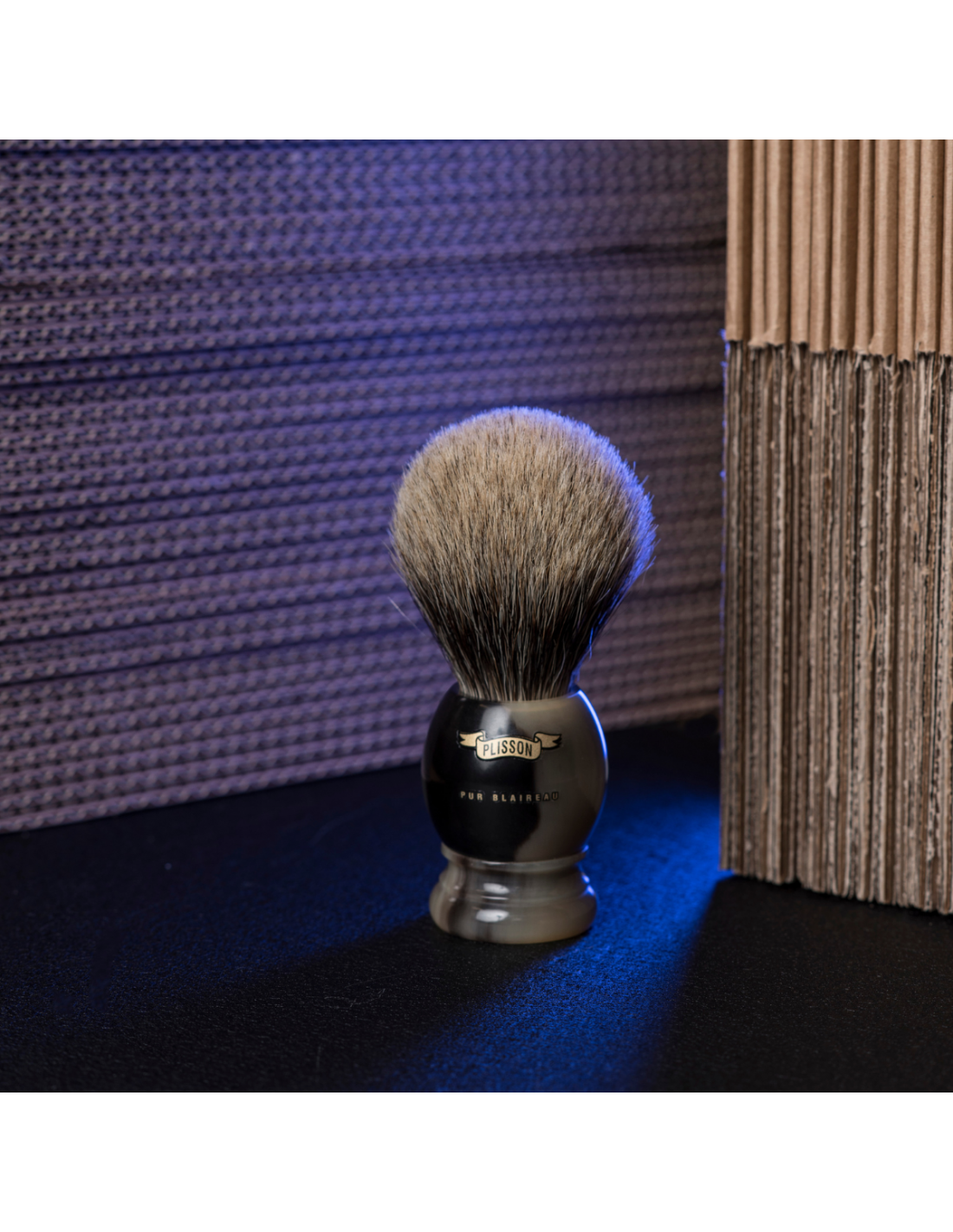 Mango elaborado en auténtico cuerno rubio y relleno de puro pelo de brocha de afeitar Blanco Alta Montaña. Gran variedad de tamaños disponibles: del n.º 8 hasta la talla 20. Fabricada a mano en los talleres Plisson en Francia. Al ser el cuerno un material natural, su color puede variar desde tonos claros hasta oscuros.