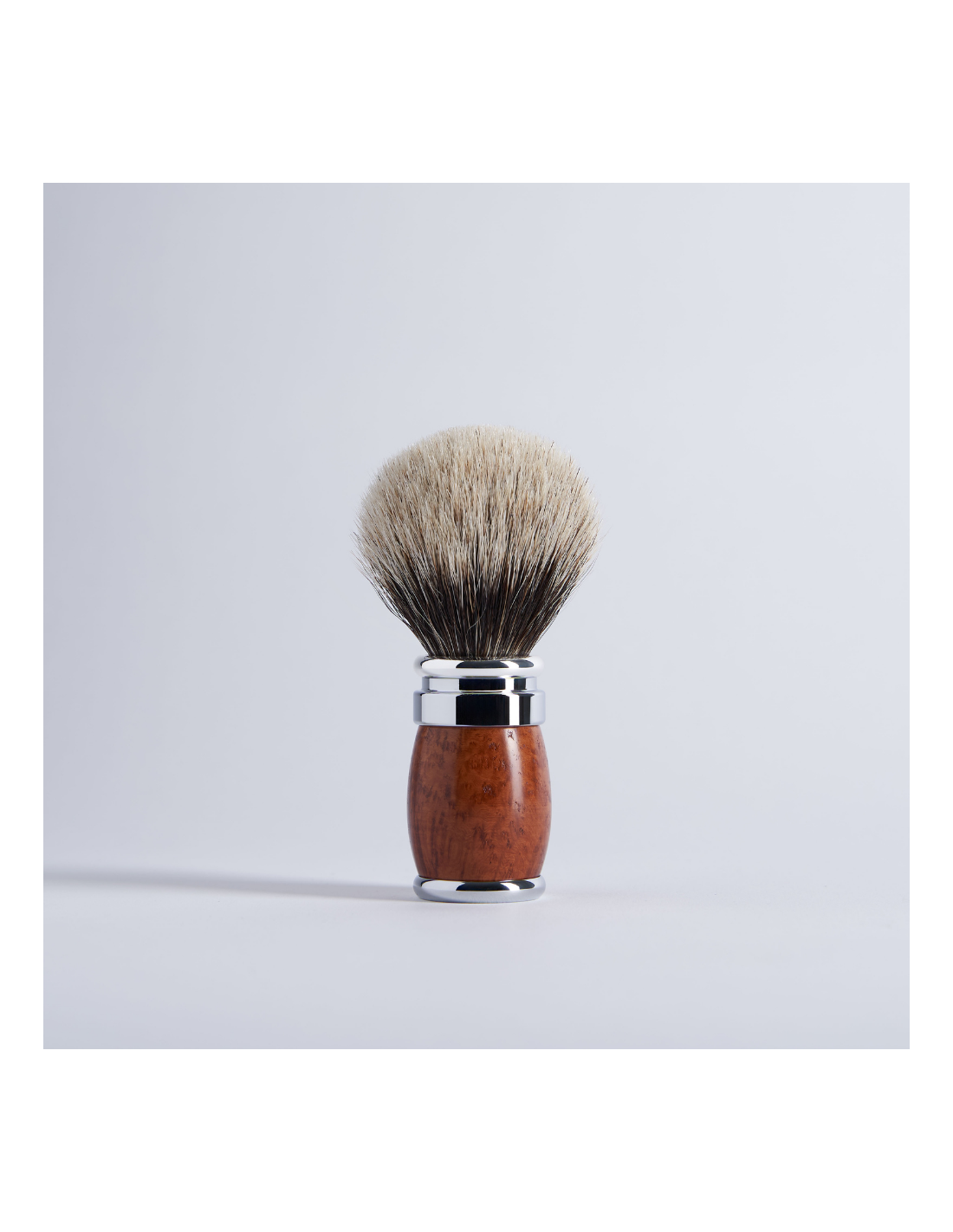 Esta brocha de afeitar tiene un acabado en cromo y un mango de madera de brezo.