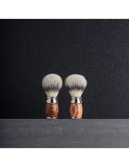 La madera de brezo está elaborada para garantizar un agarre agradable y ergonómico, y el cabezal extraíble de la brocha de afeitar está revestido de una fibra sintética que imita el " Blanco Alta Montaña ". Resistente, higiénica, flexible y extremadamente suave, esta fibra permite obtener una espuma de afeitar cremosa gracias a su poder emulsionante.