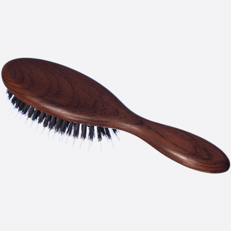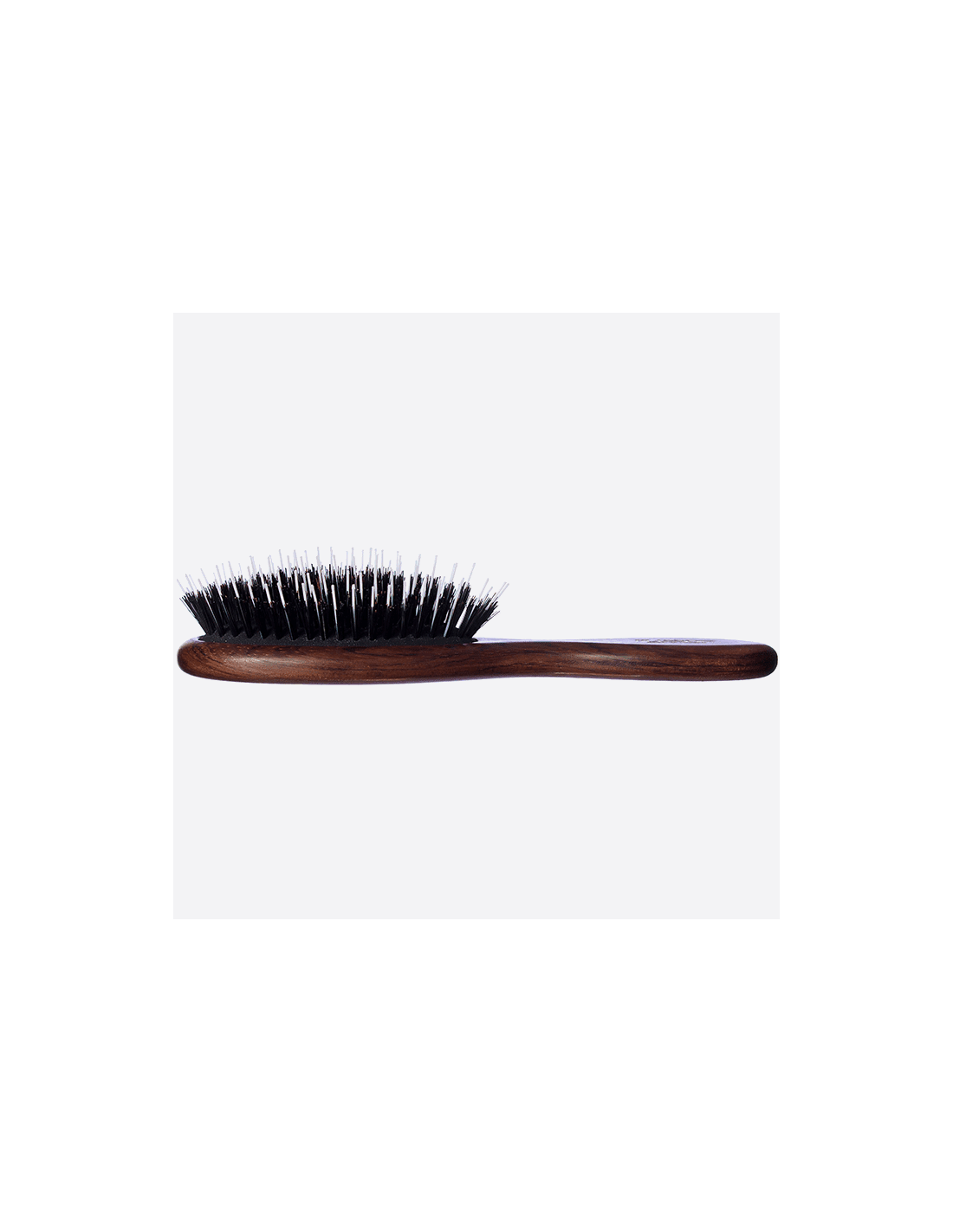 Cepillo neumático para el cabello, de tamaño pequeño (18 cm), con cerdas de jabalí. Las púas de nylon masajean el cuero cabelludo y facilitan un desenredado suave del cabello. Las cerdas de jabalí absorben las impurezas, para un alisado antiestático y un cepillado suave sin romper incluso los cabellos más frágiles. El conjunto está montado sobre un cojín neumático de caucho natural, extra suave, para ajustarse delicadamente al relieve de su cabeza. El mango del cepillo, que proporciona un agarre cómodo y ergonómico, está moldeado totalmente a mano en madera europea y fabricado en Francia.