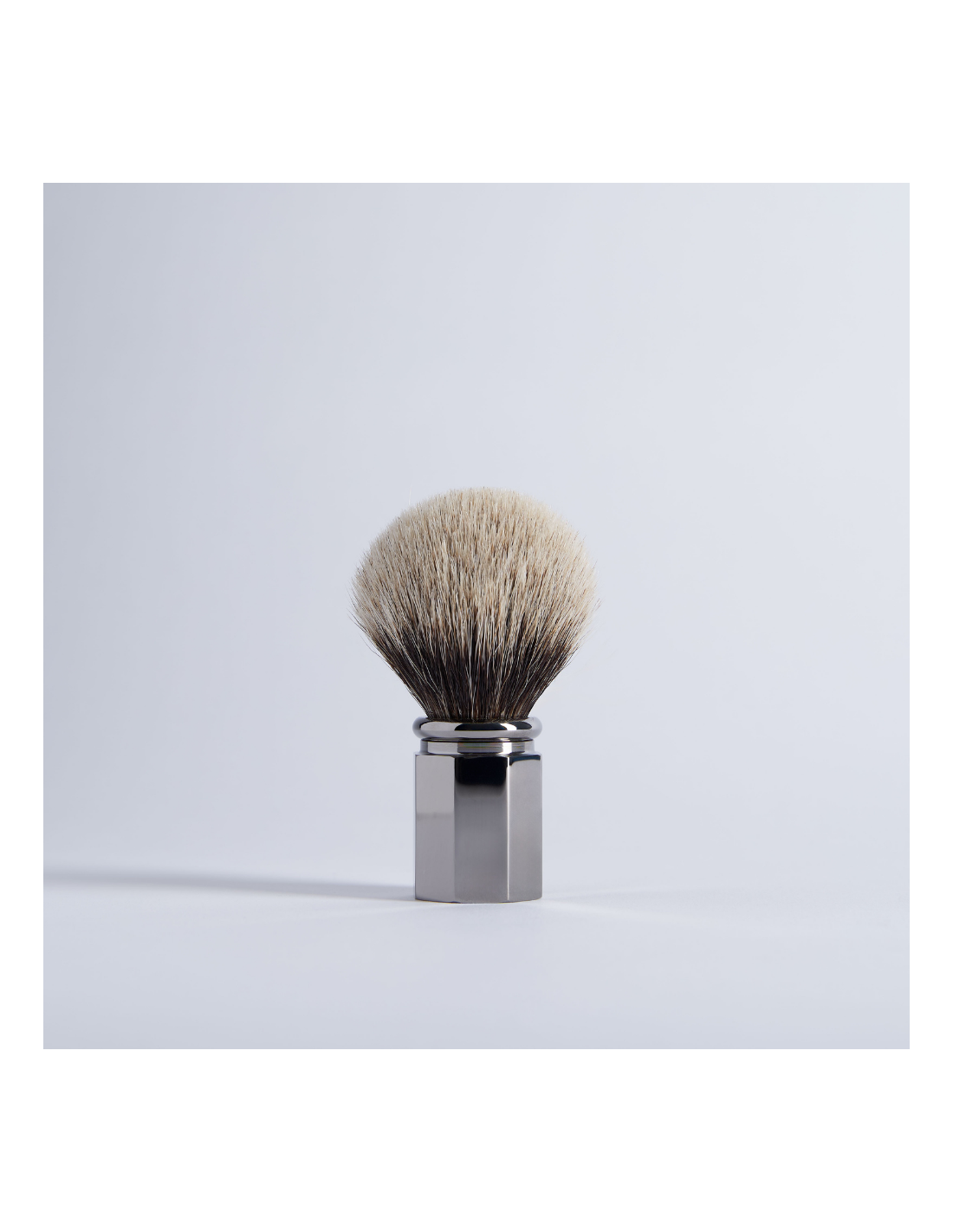 Elegante brocha de afeitar de la colección Octogonal en acabado de rutenio. La cabeza de la montura del tornillo es removible. El Blanco alta montaña es conocido por ser suave y flexible, es una de las calidades más raras de pelo.