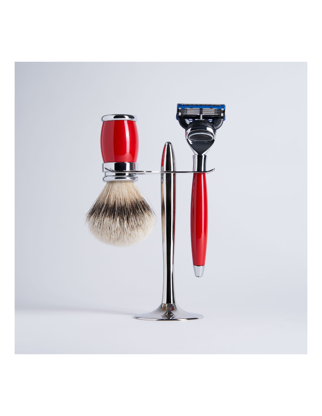 Prestigioso estuche compuesto por tres piezas de latón macizo con acabado cromado. Este set incluye una maquinilla de afeitar Fusion, una brocha de afeitar con un mechón extraíble elaborado con nuestro pelo natural blanco de alta montaña, todo ello presentado en un elegante soporte. Aporta a tu cuarto de baño la elegancia del lacado rojo de la colección Joris, una colección atemporal.