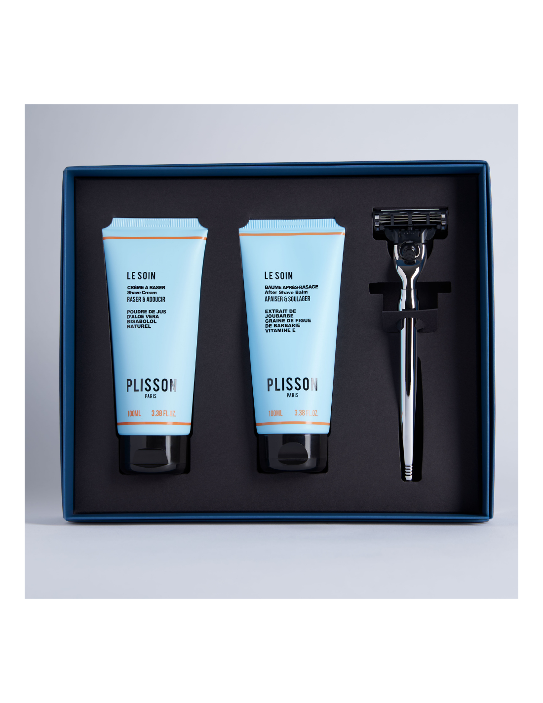 Encuentre en su caja de regalo Plisson el ritual "Glabre" con todo lo necesario para un afeitado perfecto y eficaz.