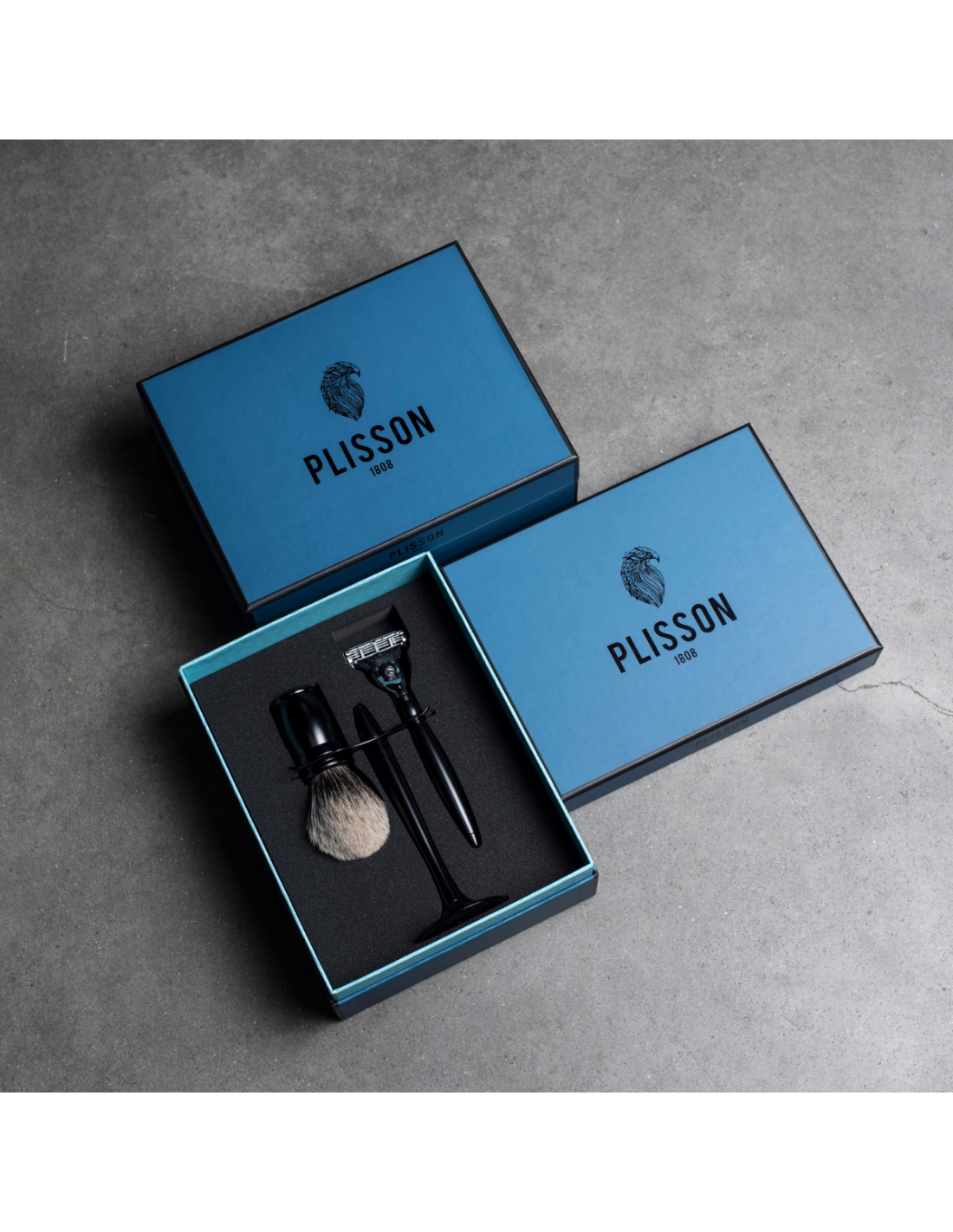 Prestigioso estuche compuesto por 3 piezas en latón macizo con acabado negro infinito. Este set incluye un rastrillo compatible con Mach3, una brocha de afeitar con cabezal desmontable de pelo Gris Europeo, todo elegantemente dispuesto sobre un soporte de lujo. Un toque de distinción para el cuarto de baño de un caballero.
