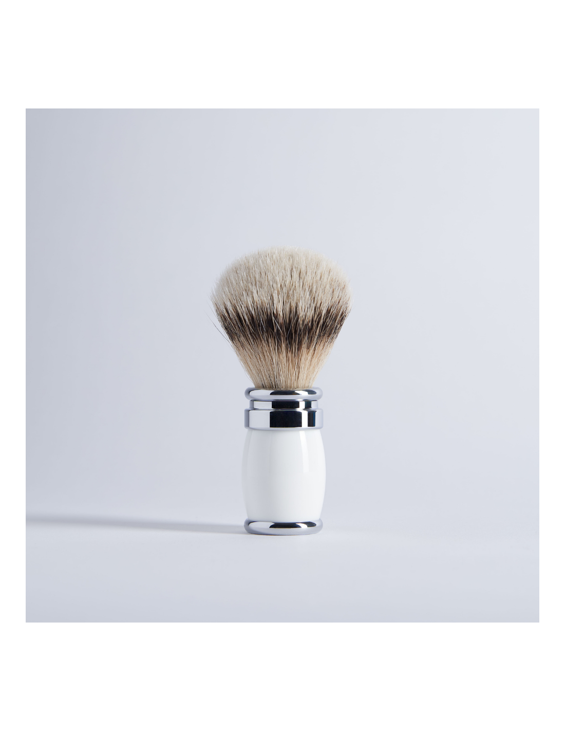 Elegante cepillo de afeitar de la colección Joris, con mango lacado y acabado en latón cromado. Esta magnífica pieza tiene una cabeza extraíble de tamaño 12 rellena de puro Blanco Alta Montaña. Fabricado en Francia. Este modelo está disponible en 3 colores: blanco, negro y rojo.