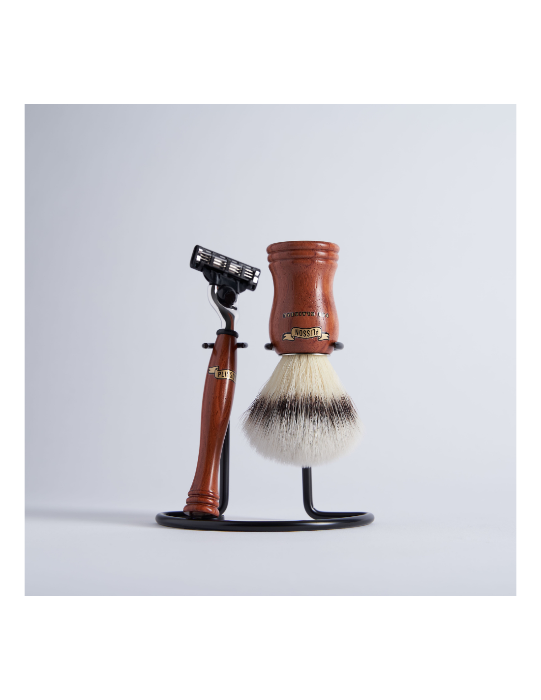 Hermoso juego de la gama Plisson, ideal para aprender sobre el afeitado tradicional. El conjunto consiste en un hermoso tejón de la talla 12, el más utilizado, con un mango de madera Bubinga de forma alta.